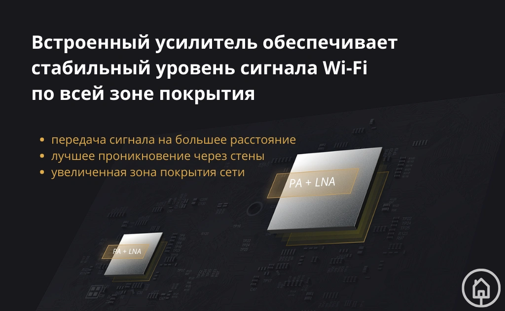 Роутер имеет два встроенных усилителя на обоих микропроцессорах разной частоты. Усилитель РА повышает мощность передачи сигнала, а усилитель с низким уровнем шума LNA улучшает чувствительность приемника.