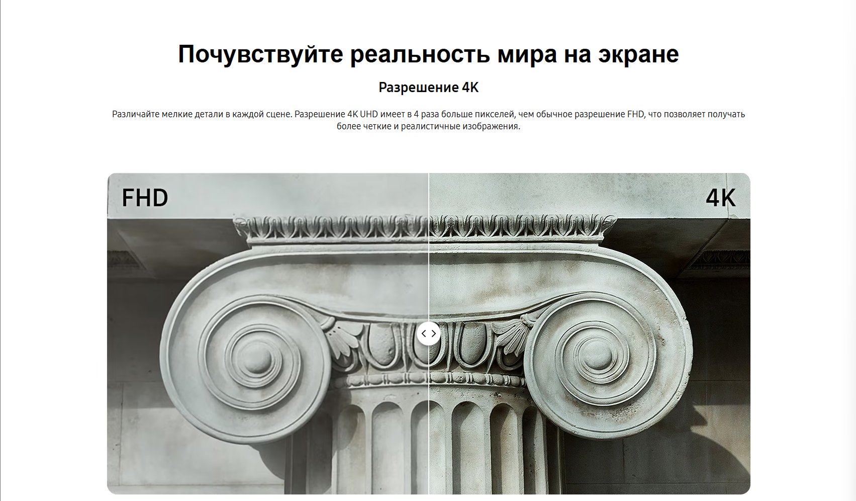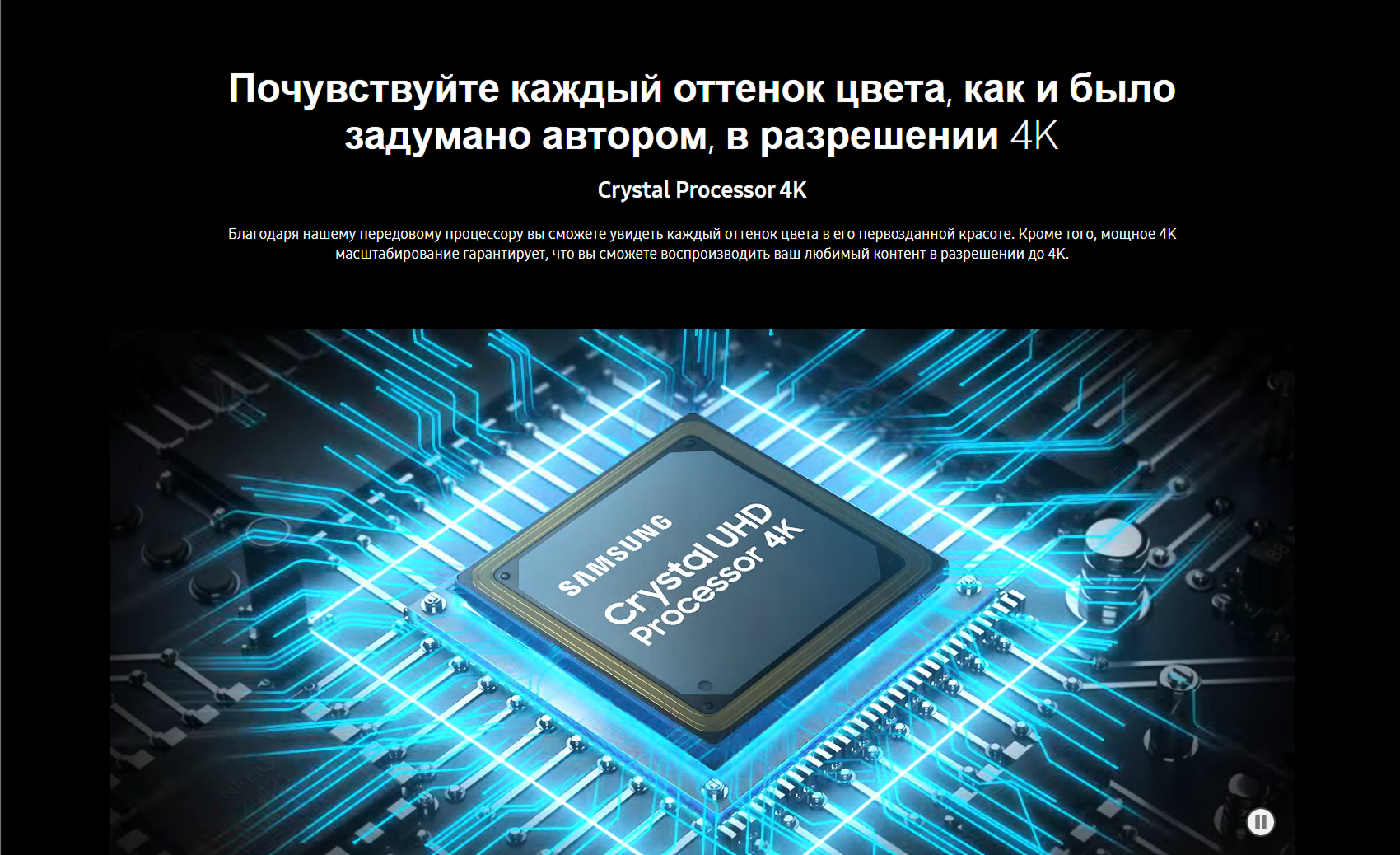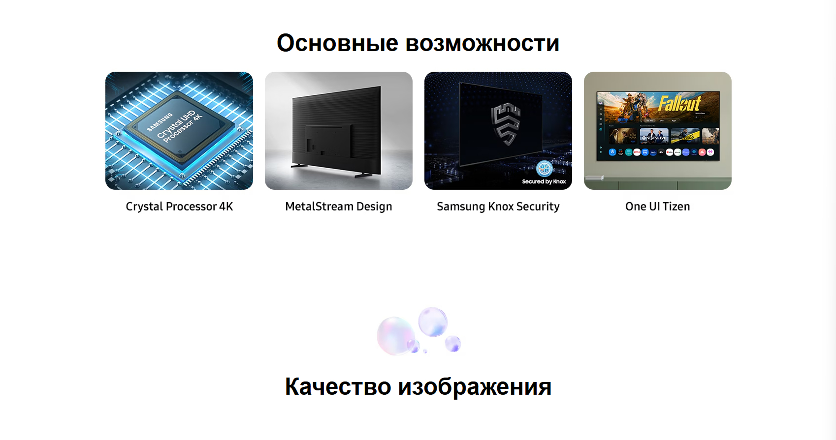 Samsung U8001F seriyali televizori tasvir sifati, realistik ovoz va zamonaviy dizaynni o‘zida uyg‘unlashtiradi. Crystal Processor 4K protsessori har qanday kontentni avtomatik ravishda 4K darajasiga yaqinlashtirib, tasvirning tiniqligi va ranglarni yaxshilaydi. PurColour texnologiyasi yordamida ekran yorqin va jonli ko‘rinadi, HDR10+ esa yorug‘ va qorong‘i sahnalarda ham barcha detallarni ko‘rsatadi.