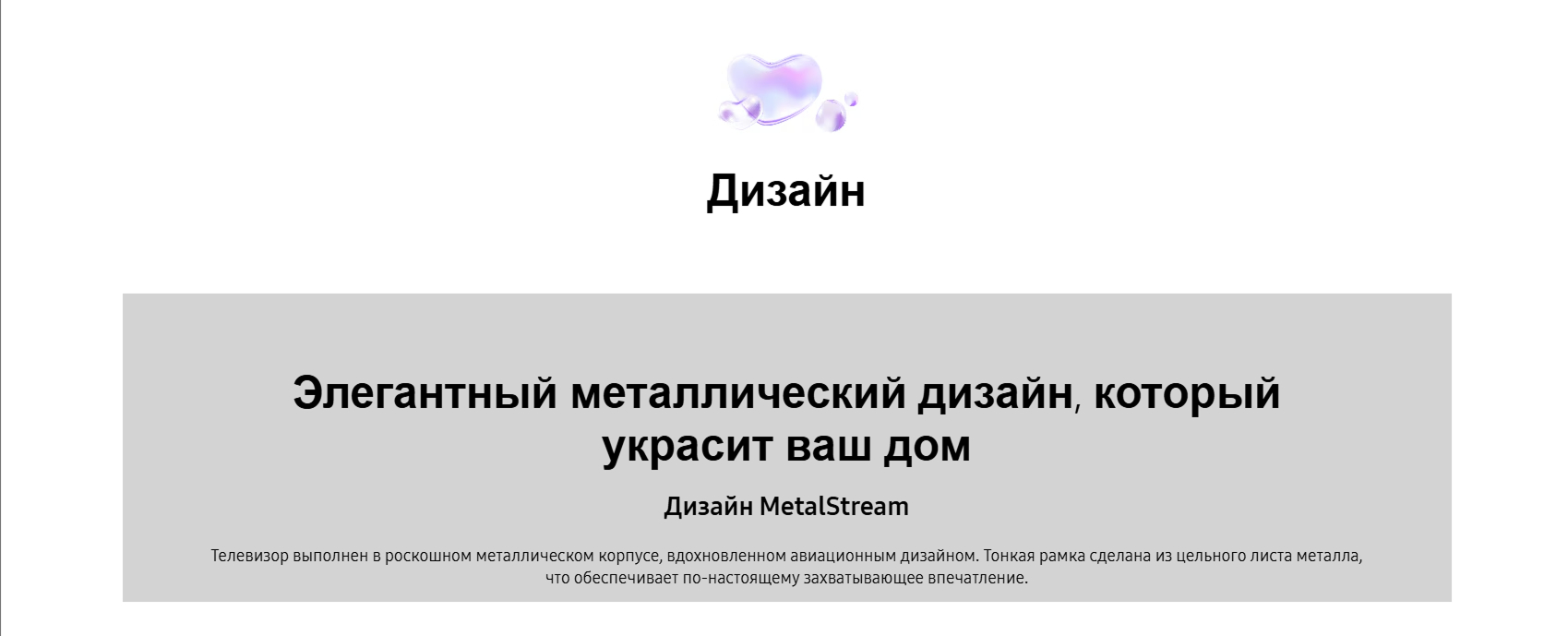 Televizorning korpusi juda yupqa, metall ramkali va kabel uchun maxsus yashirin kanallarga ega. Bu dizayn devorga osish yoki zamonaviy mebelga joylashtirish uchun juda qulay.