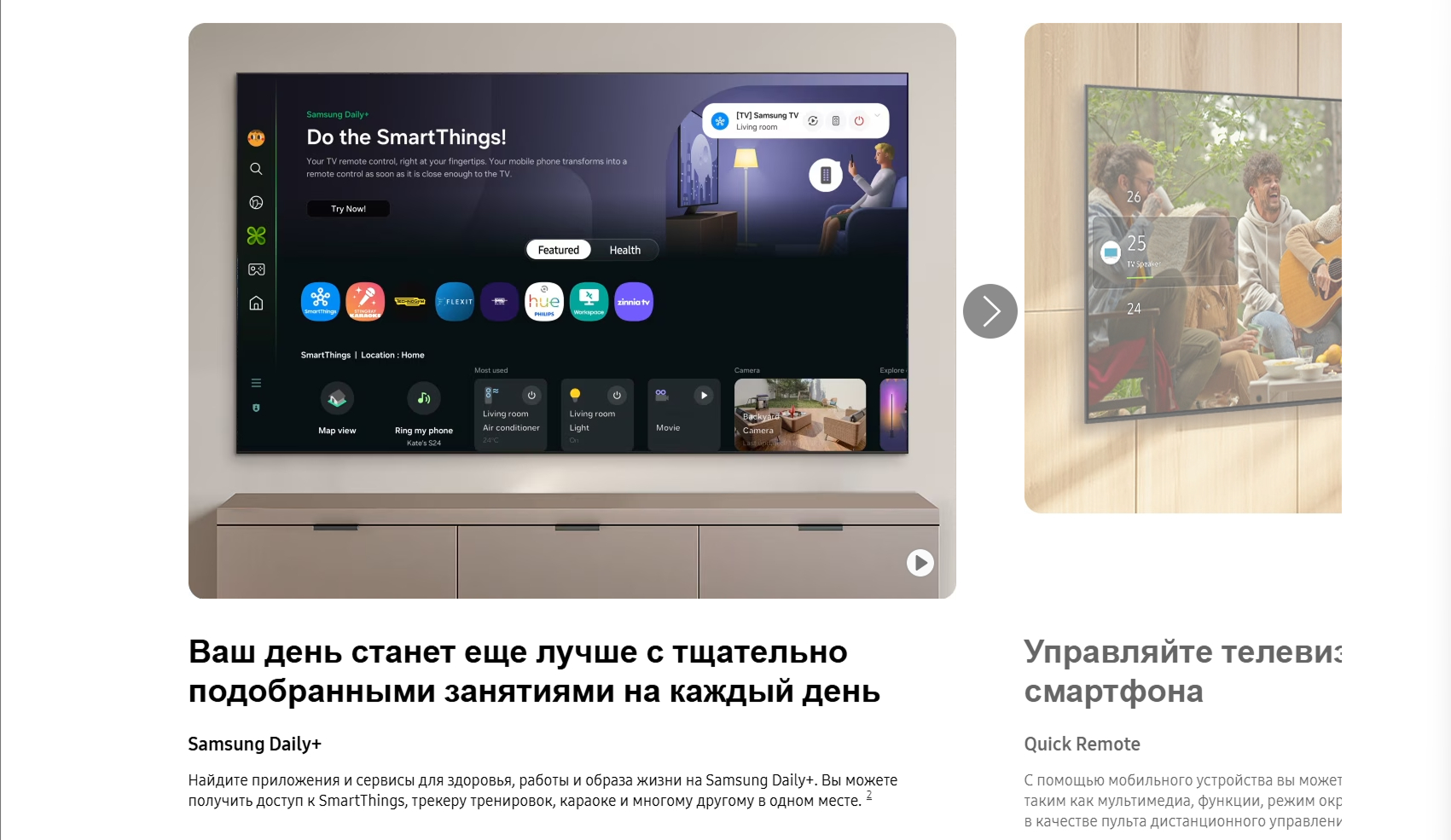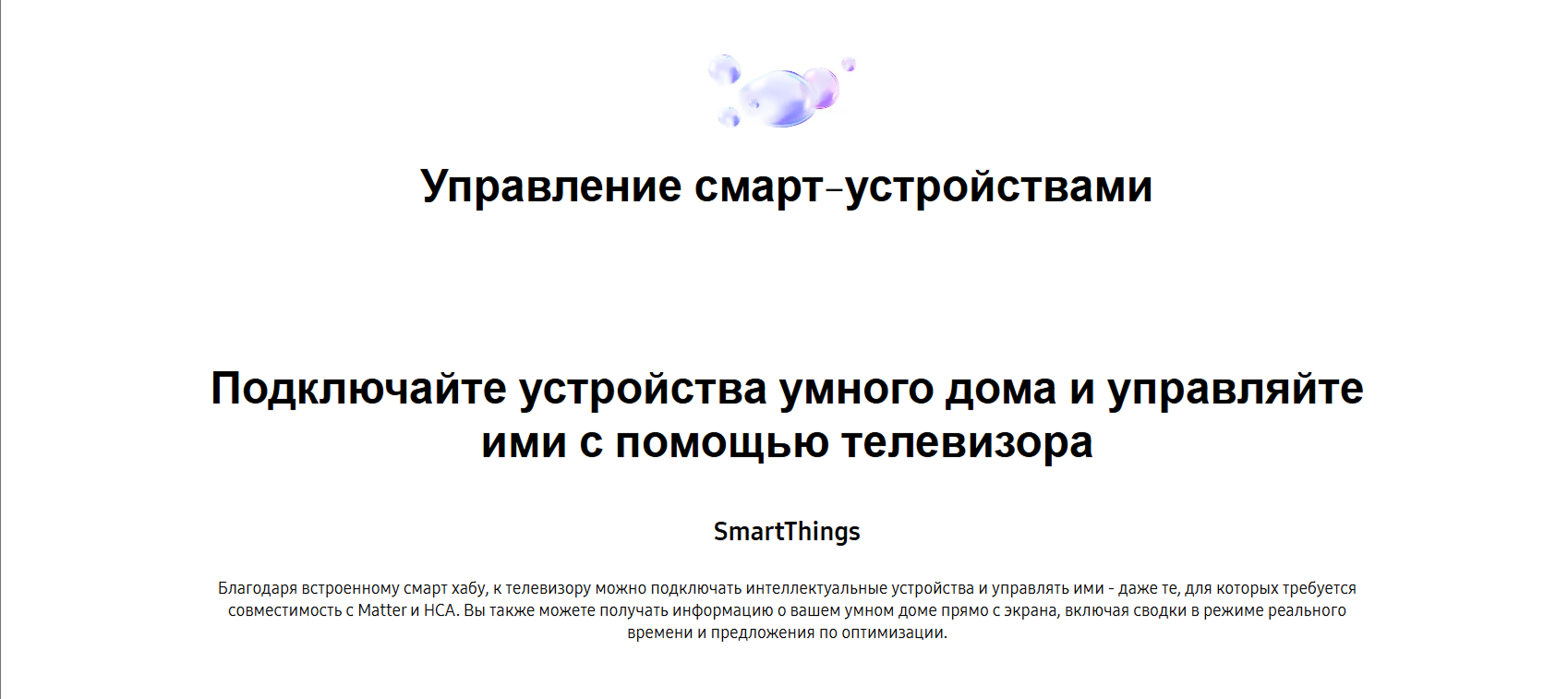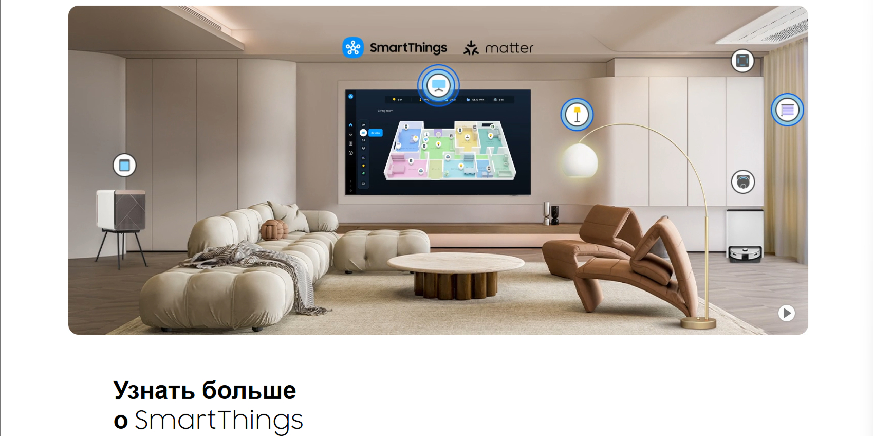 Tizen aqlli platformasi yordamida YouTube, Netflix, Megogo va boshqa ilovalarga tez kirish mumkin. Smart funksiyalar orasida ovozli boshqaruv, Multi View, Apple AirPlay va Samsung SmartThings qo‘llab-quvvatlovi mavjud — televizor va boshqa qurilmalarni bir joyda boshqarish yanada qulay.