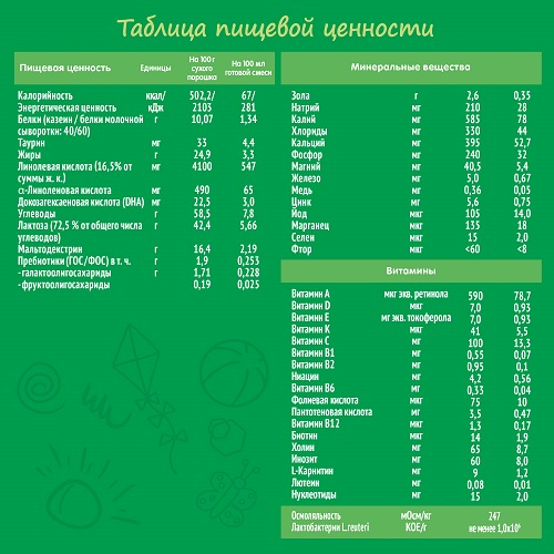 Lutein va Omega-3 PUFAlar miya rivojlanishiga yordam beradi. Aralashda uyg'un o'sish va rivojlanish uchun vitaminlar va minerallarning muvozanatli kompleksi mavjud.
