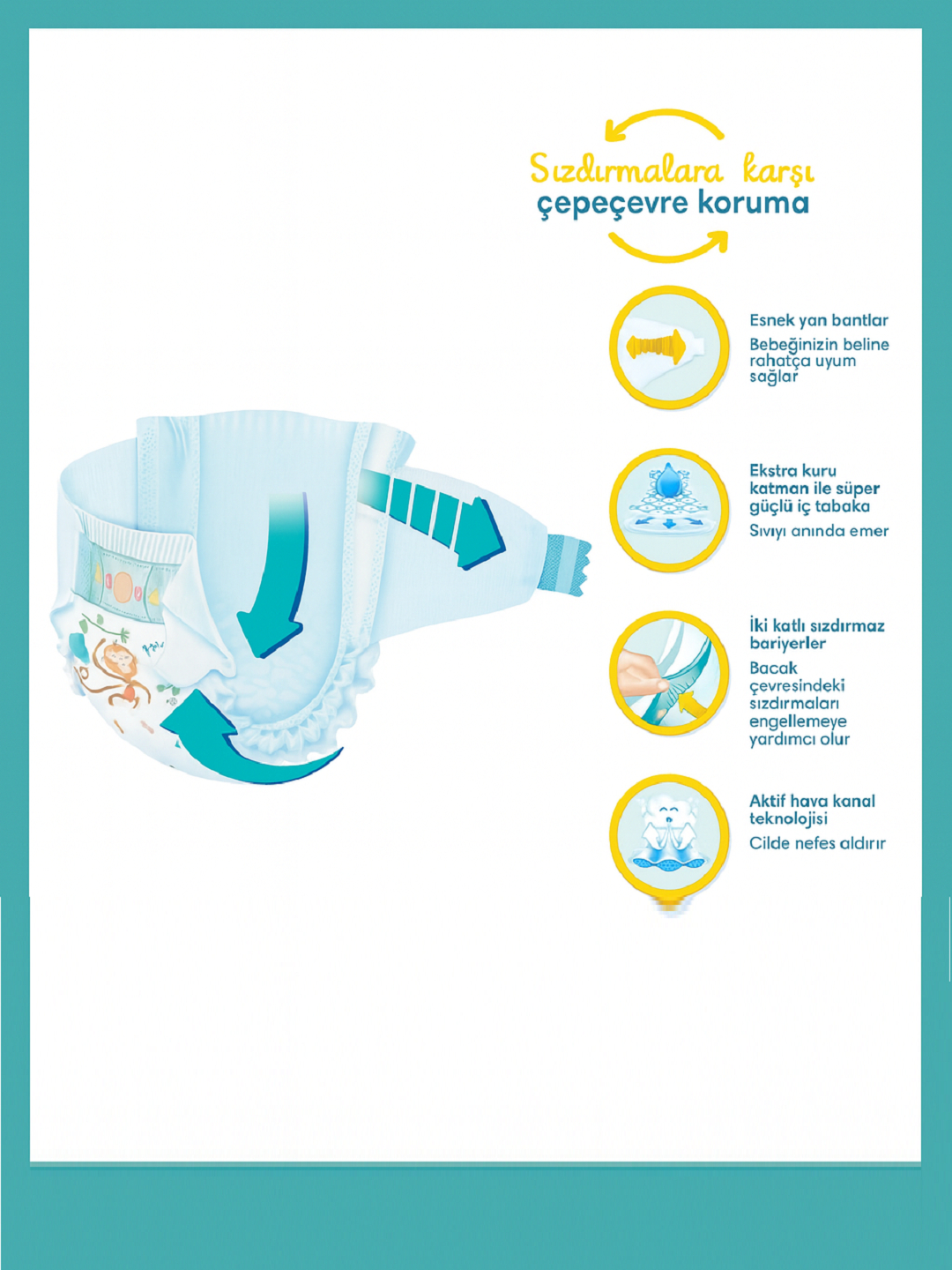 Prima Aktif Bebek 5-razmer tagliklar — 11–16 kg vazndagi bolalar uchun mo‘ljallangan bo‘lib, faol bolajonlar uchun ideal tanlovdir. 12 soatgacha quruqlikni ta’minlab, erkin harakat qilish imkonini beradi.