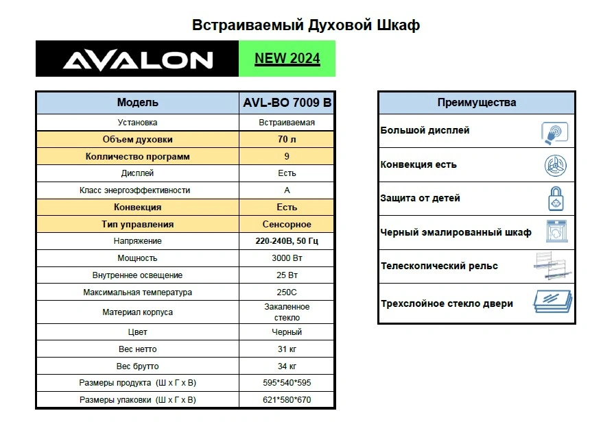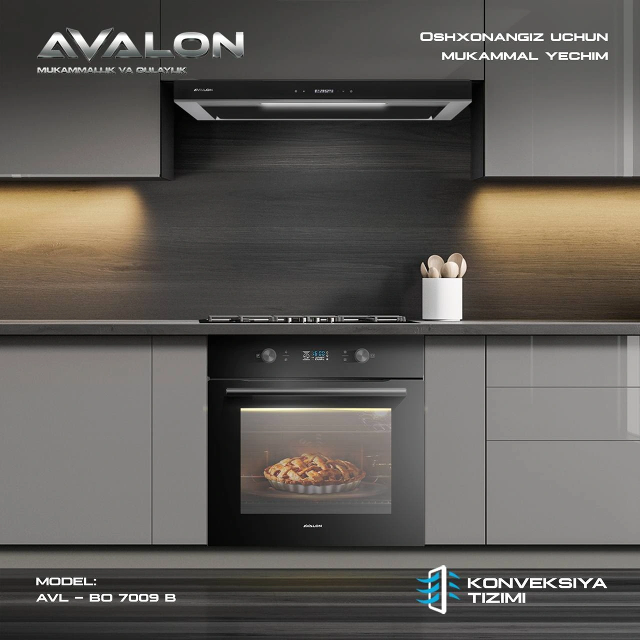 AVL – BO 7009 pechini oshxonaning har qanday qulay joyiga o'rnatish mumkin, bu shart emas, balki pechning tagida. Model qurilmani ishlatishda maksimal qulaylikni ta'minlash uchun mo'ljallangan o'zining sensorli boshqaruv tizimi bilan jihozlangan. Shkafning ichki hajmi 70 litrni tashkil etadi, bu sizga katta idishlarni tayyorlash imkonini beradi. Afzalliklari: katta displey, konveksiya, bolalar himoyasi, qora emalli shkaf, teleskopik rels, uch qavatli shisha eshik.