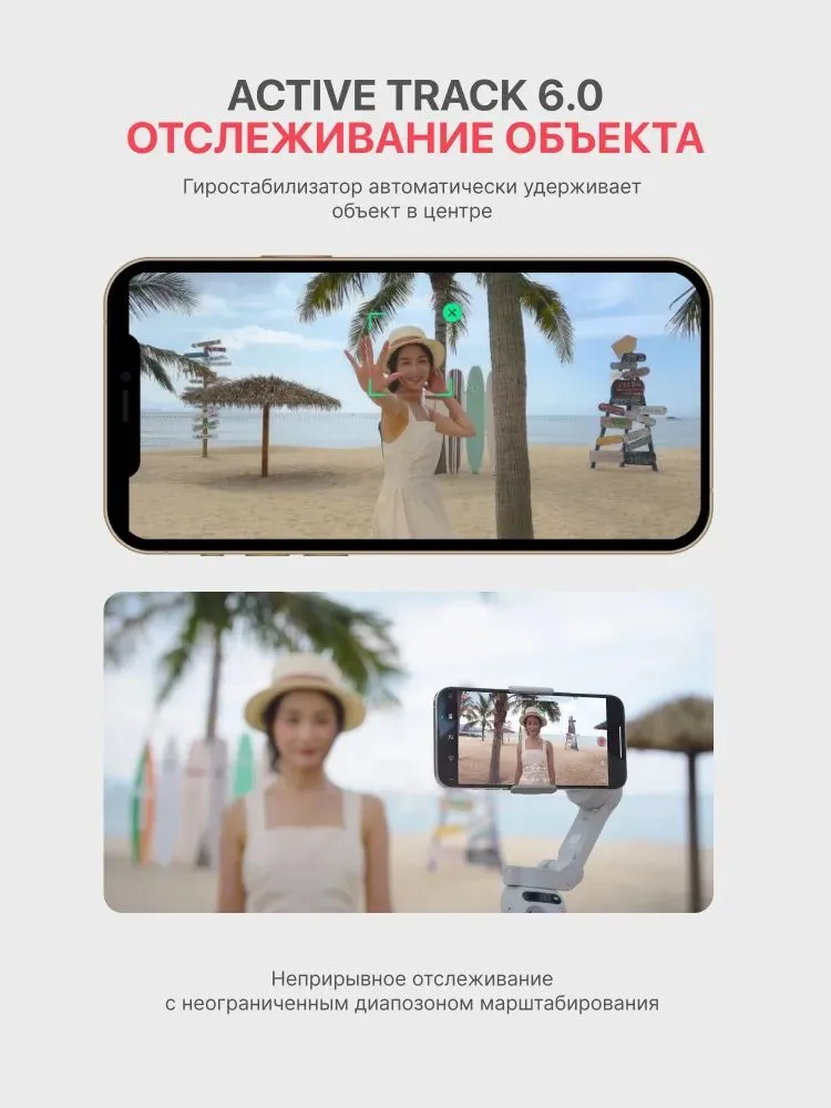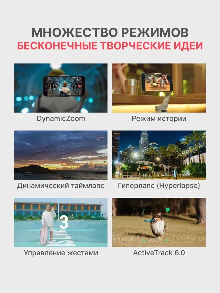 Функционал ActiveTrack 6.0 позволяет надежно отслеживать объекты, даже в сценах с участием нескольких человек или во время движения объекта. Отслеживайте свой объект с неограниченным диапазоном масштабирования, создавая более богатые визуальные эффекты и добавляя кинематографический штрих в ваши кадры. Также доступны привычные режимы таймлапса, панорамы и Dolly Zoom.