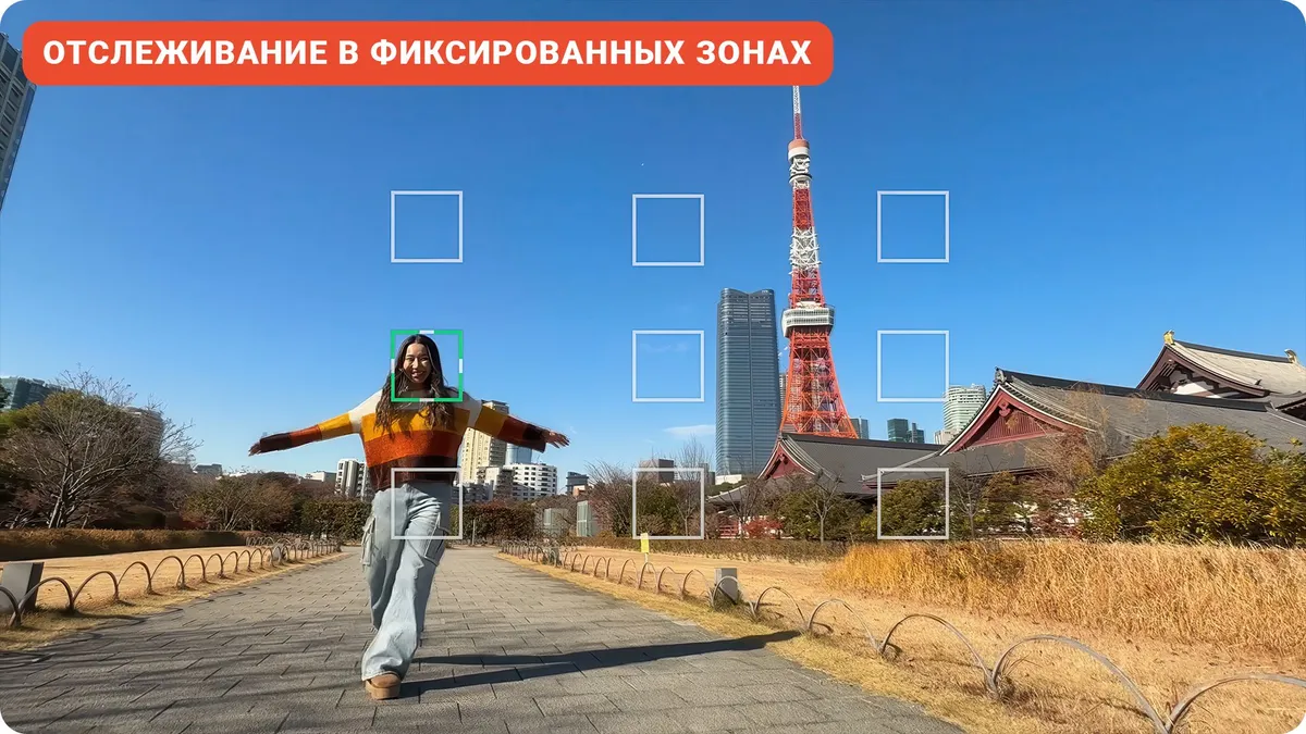 Выбирайте одну из 9 зон для отслеживания на сетке, чтобы выставить идеальный кадр и не терять из поля зрения нужный объект.