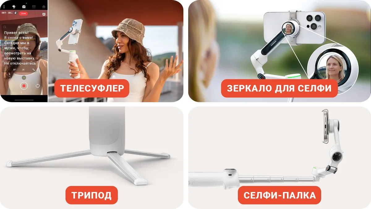 Стабилизатор обладает богатым функционалом для съемки самого себя без посторонней помощи. Это и телесуфлер встроенный в приложение, и зеркало для съемки селфи на основную камеру, и новый алюминиевый трипод, который быстро выдвигается из ручки, и, конечно же, встроенная селфи-палка для удобных ракурсов.