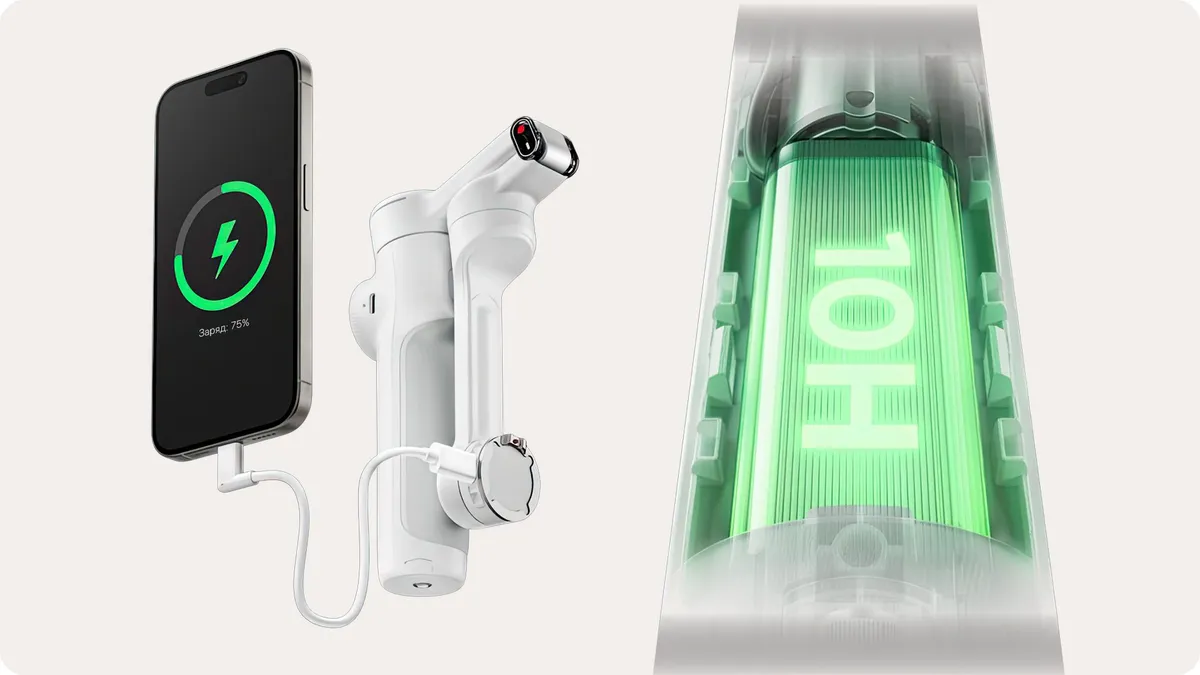 Снимайте без остановки вплоть до 10 часов на одном заряде. А если внезапно разрядился смартфон, подключайте его прямо к стабилизатору и заряжайтесь от него.