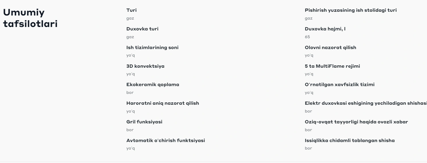 - Gaz nazorati: Xavfsizlik uchun avtomatik gaz nazorati tizimi (duxovka yoki konforka olovi o'chsa, gaz ta'minoti avtomatik ravishda to'xtaydi).