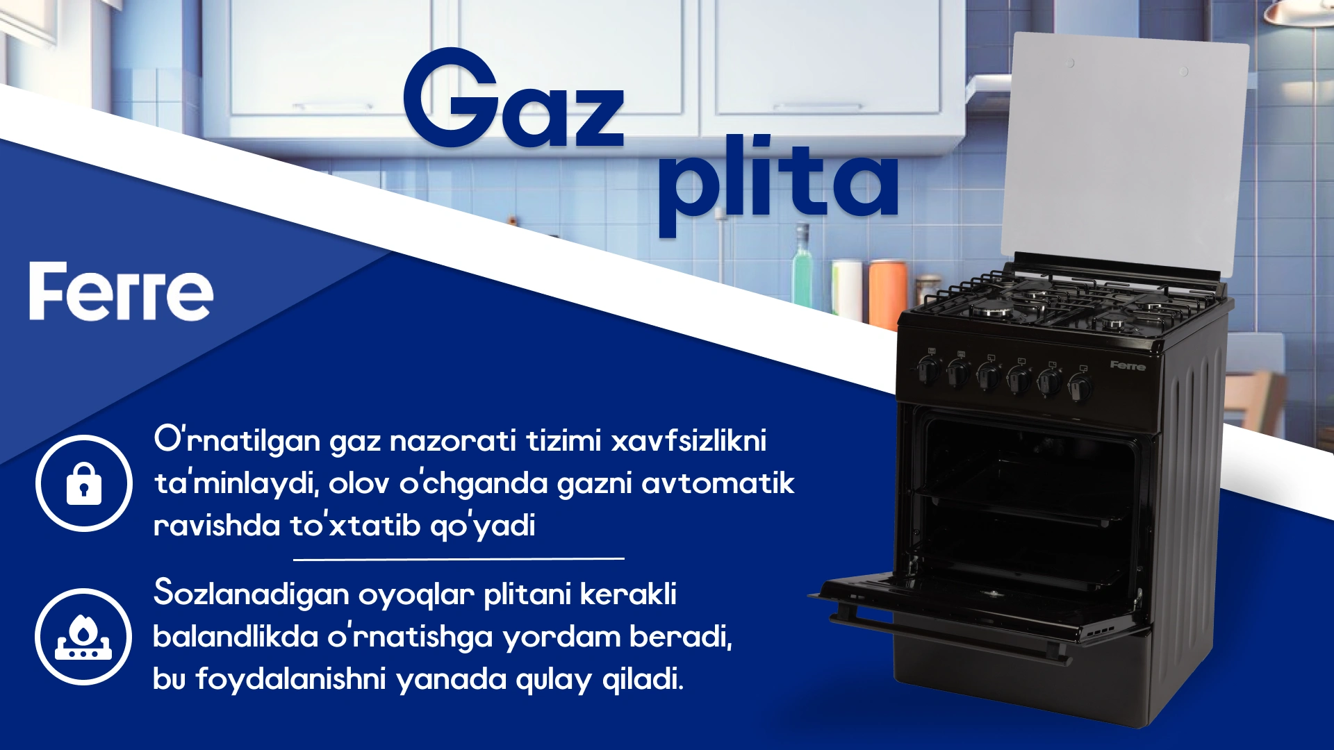 Plita turi – gaz: Ferre gaz plitasi ochiq olovda ovqat pishirish imkonini beradi, bu issiqlikning teng taqsimlanishini ta'minlaydi va har xil taomlarni tayyorlashda a'lo natijalarga erishishga yordam beradi. Gaz plitalari yuqori energiya samaradorligi va haroratni aniq boshqarish uchun qadrlanadi.