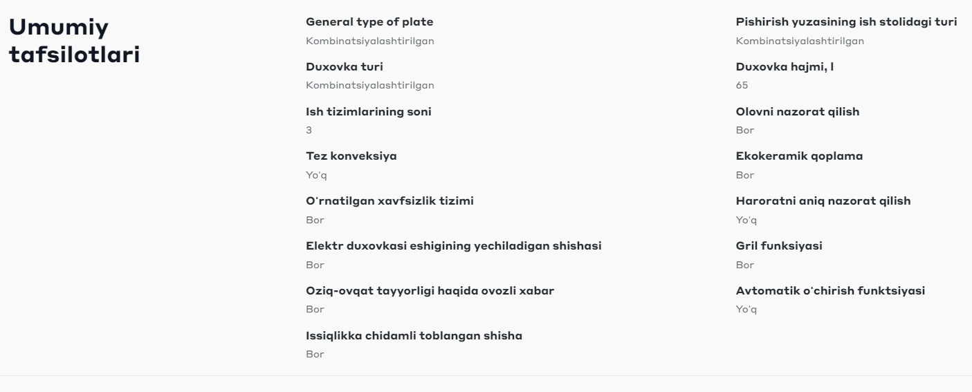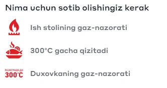 - Plita turi: kombinatsiyalangan (kombinatsiyalangan pishirish yuzasi va kombinatsiyalangan duxovka)