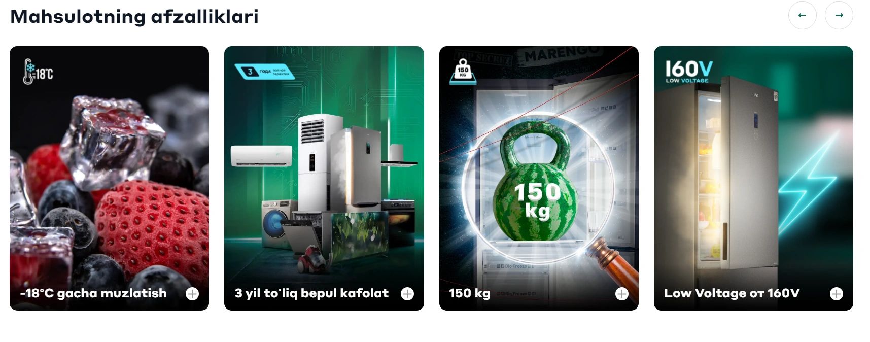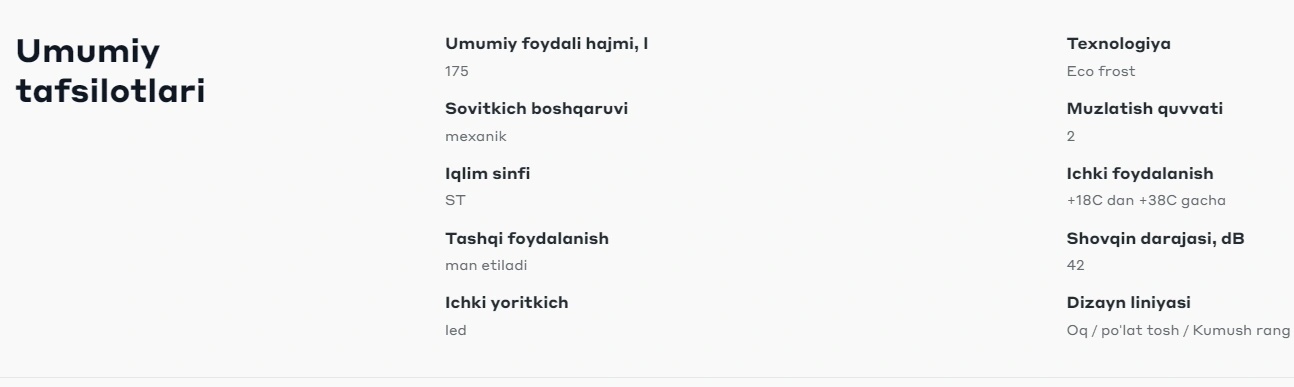 - Sovutish tizimi: ECO FROST — No Frost tizimiga o'xshash, muz to'planishining oldini oladi va ichki temperaturani barqaror ushlab turadi.