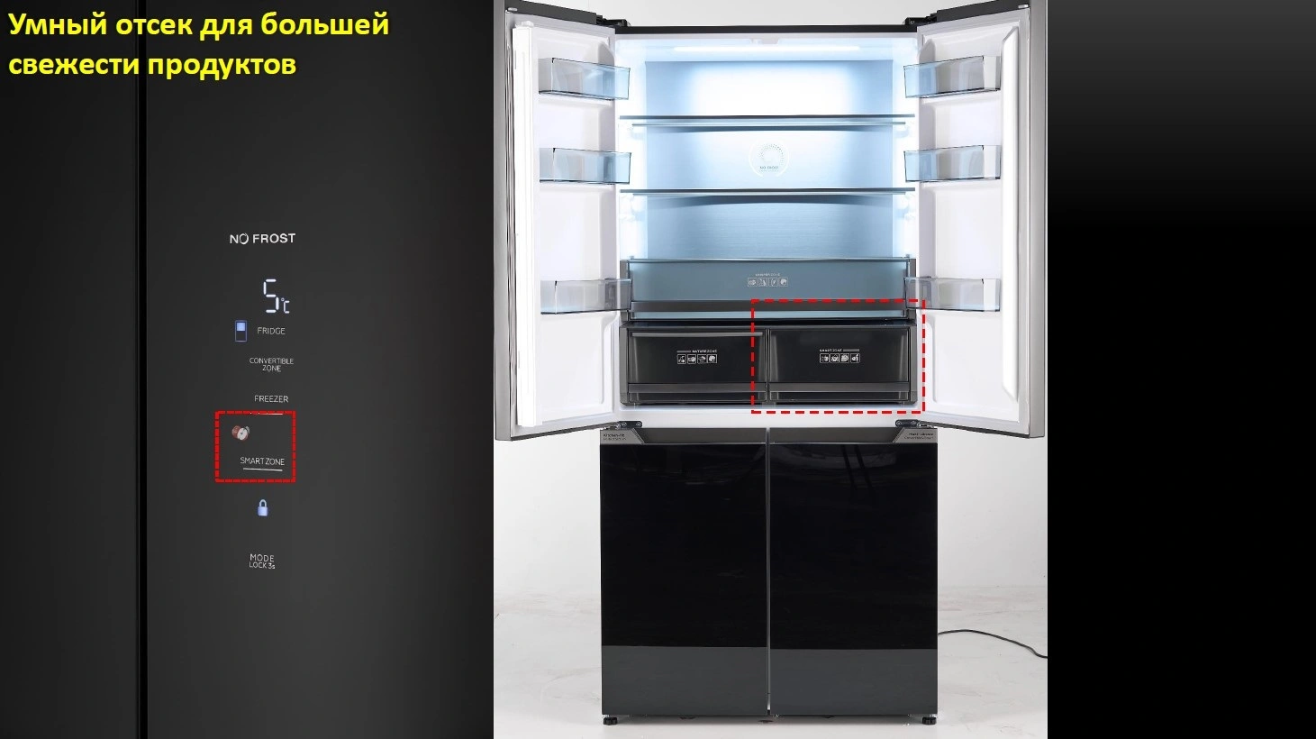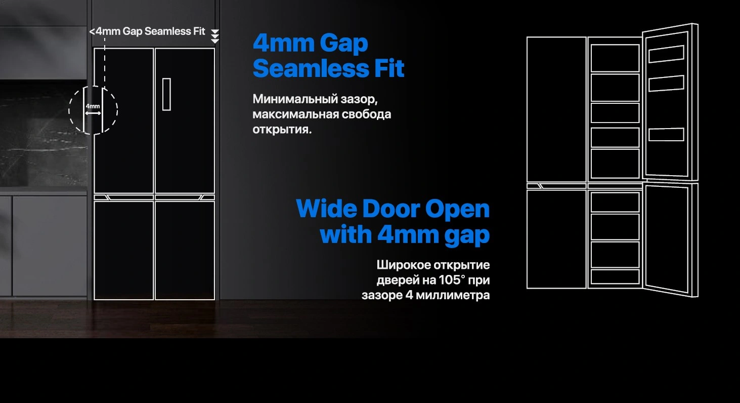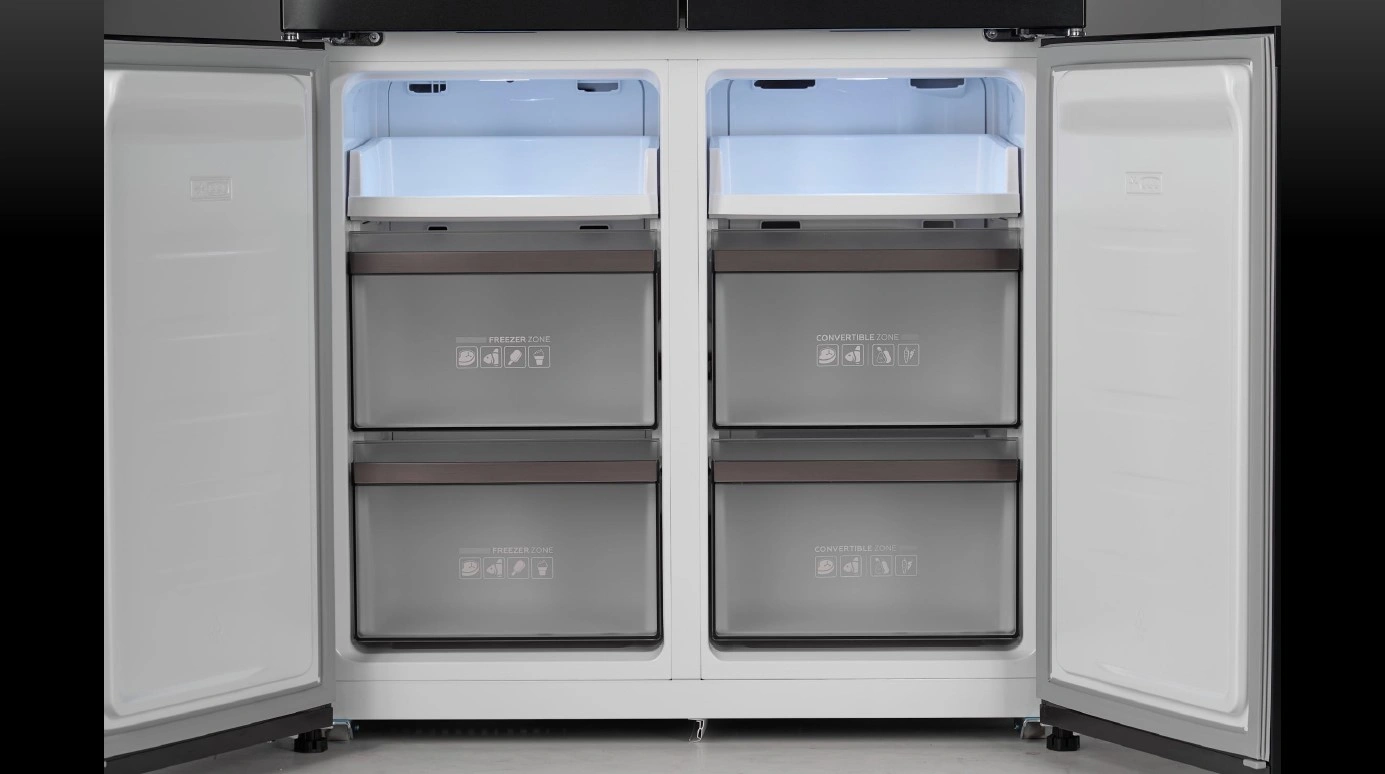 Muzlatgichning ikkita eshigi bor, bu esa mahsulotlarni istalgan tomondan osonlikcha olish imkonini beradi. Bu, ayniqsa, mahsulotlarni yuqori yoki pastki javondan olishni istasangiz, juda qulay.