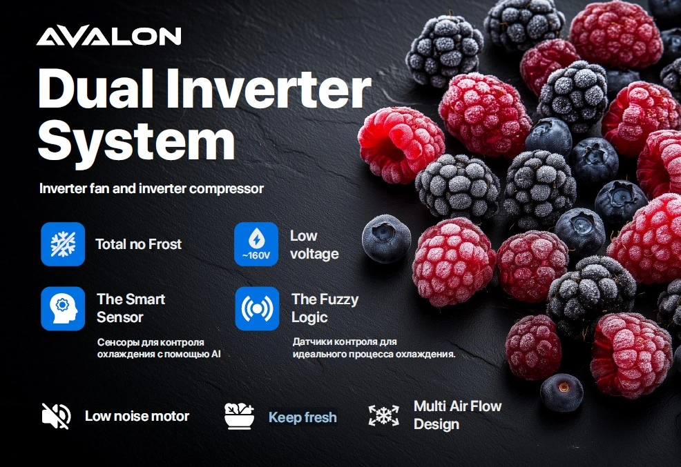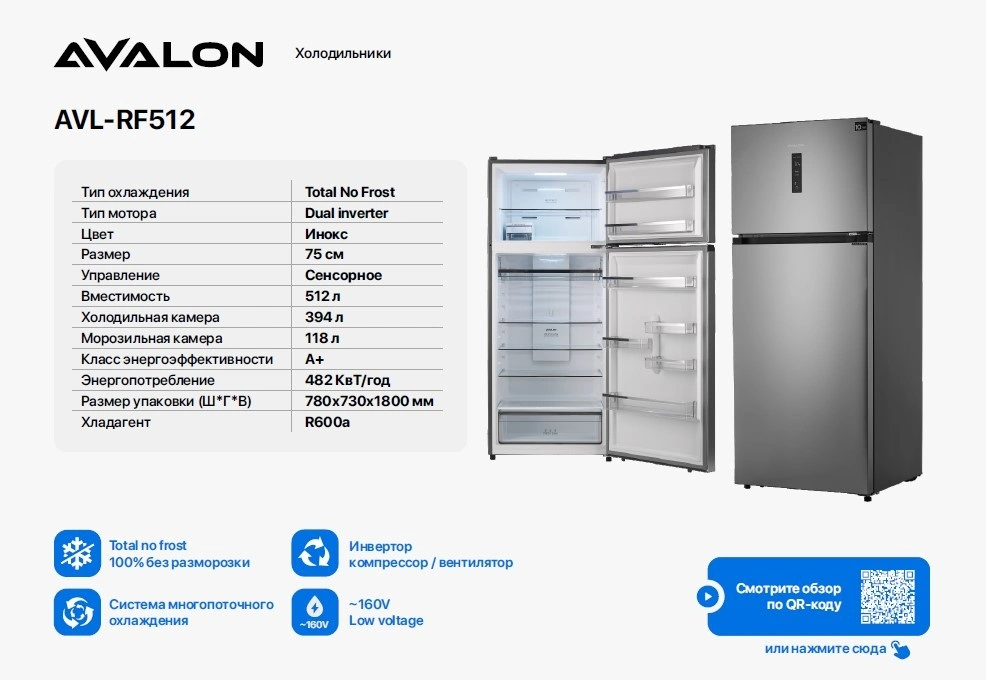 Avalon AVL-RF512 muzlatgichi mahsulotlarda va muzlatgichning ichki devorlarida muz va qirov paydo bo‘lishining oldini oluvchi No Frost tizimi bilan jihozlangan. Bu mahsulotlarni yanada gigiyenik saqlashni ta’minlaydi va tozalash jarayonini osonlashtiradi.