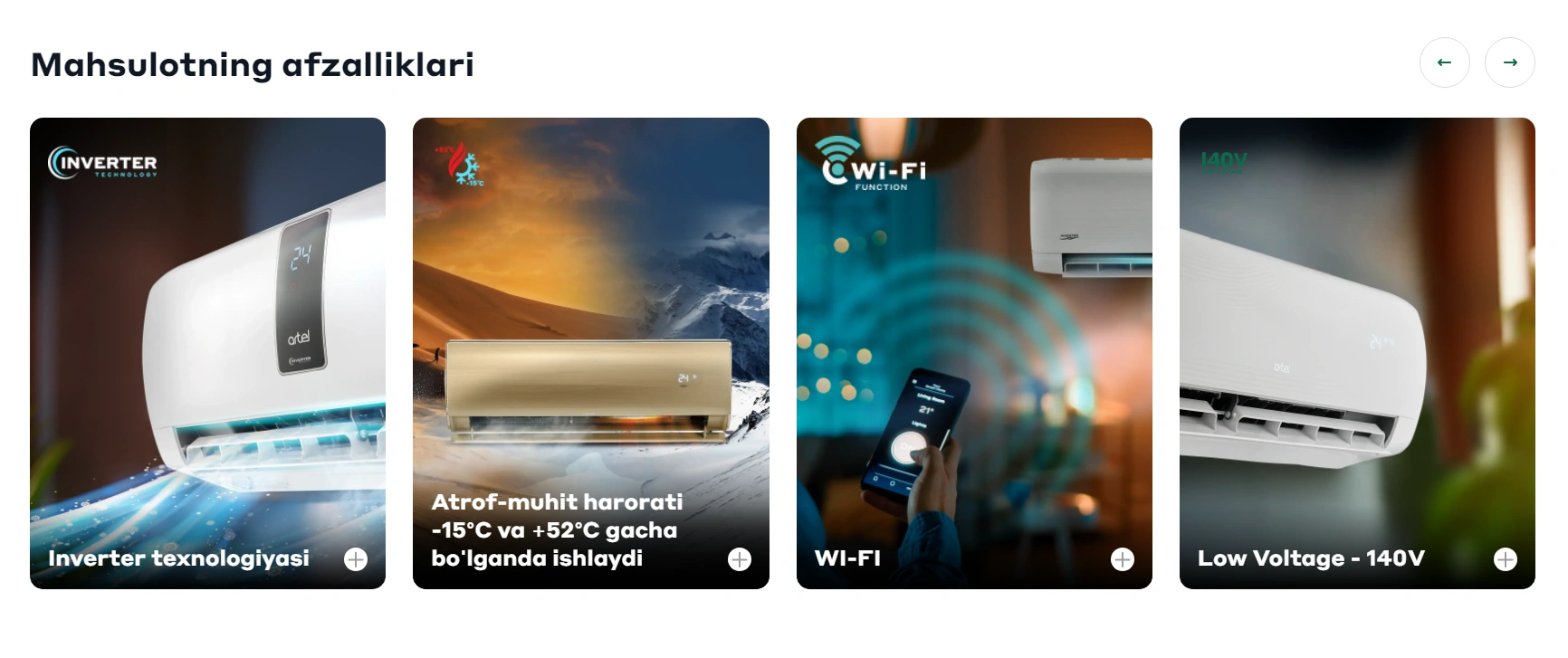 Artel konditsionerlari zamonaviy invertorli kompressor bilan jihozlangan bo‘lib, u deyarli jim ishlashni, energiya sarfini kamaytirishni, belgilangan haroratga tez kirishni va ishonchlilikni oshiradi.