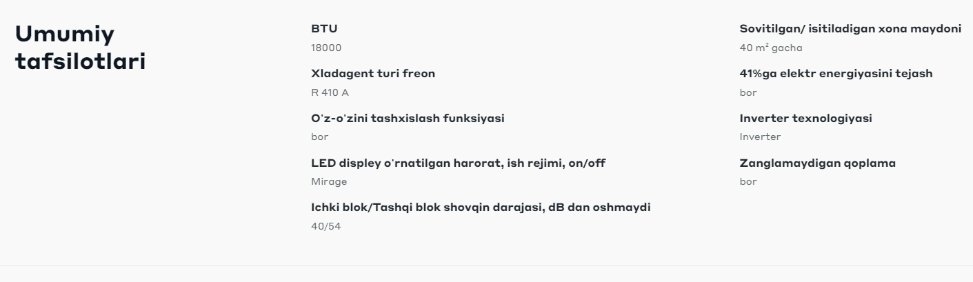 - Konditsioner quvvati (BTU): 18