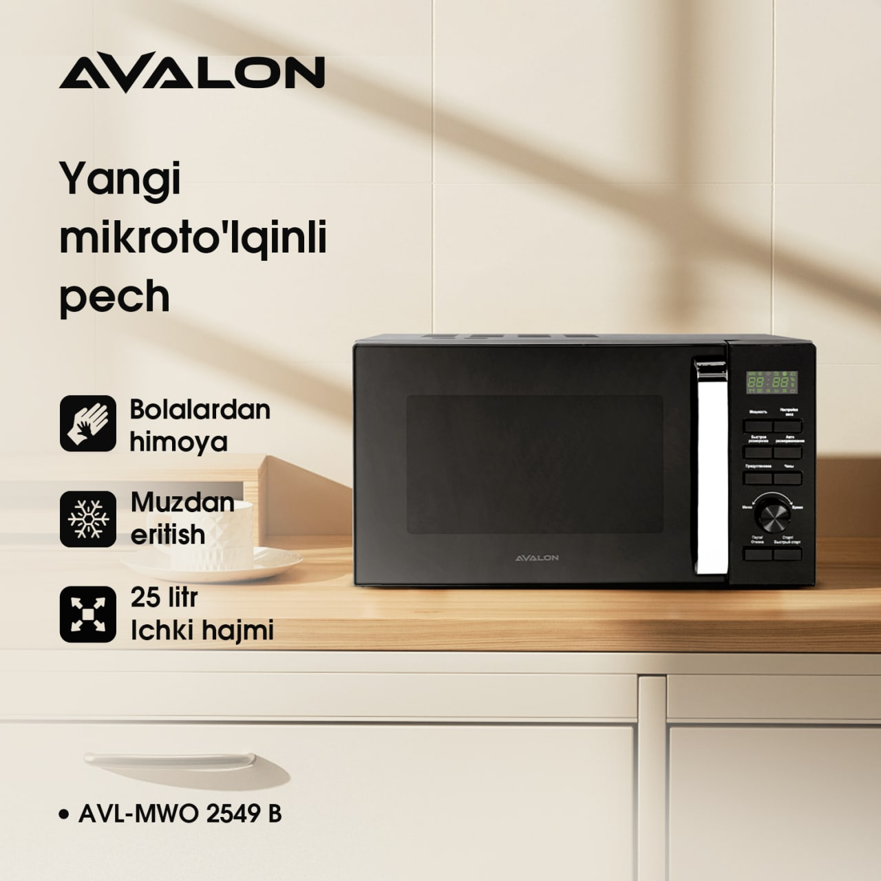 AVL-MWO 2549 B mikroto'lqinli pechning ichki hajmi 25 litrni tashkil qiladi. Boshqarish old panelda joylashgan boshqaruv tugmalari yordamida amalga oshiriladi. Bu sizga bir necha bosqichda optimal pishirish dasturini o'rnatish imkonini beradi. Ushbu modelda taymer ham mavjud. Ushbu mikroto'lqinli pechning maksimal quvvati 900 Vt.