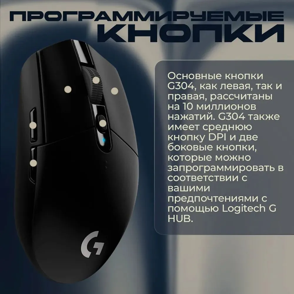 Эргономичный дизайн: G304 Logitech имеет компактную и лёгкую конструкцию, которая комфортно ложится в руку, обеспечивая удобство даже при долгих игровых сессиях.