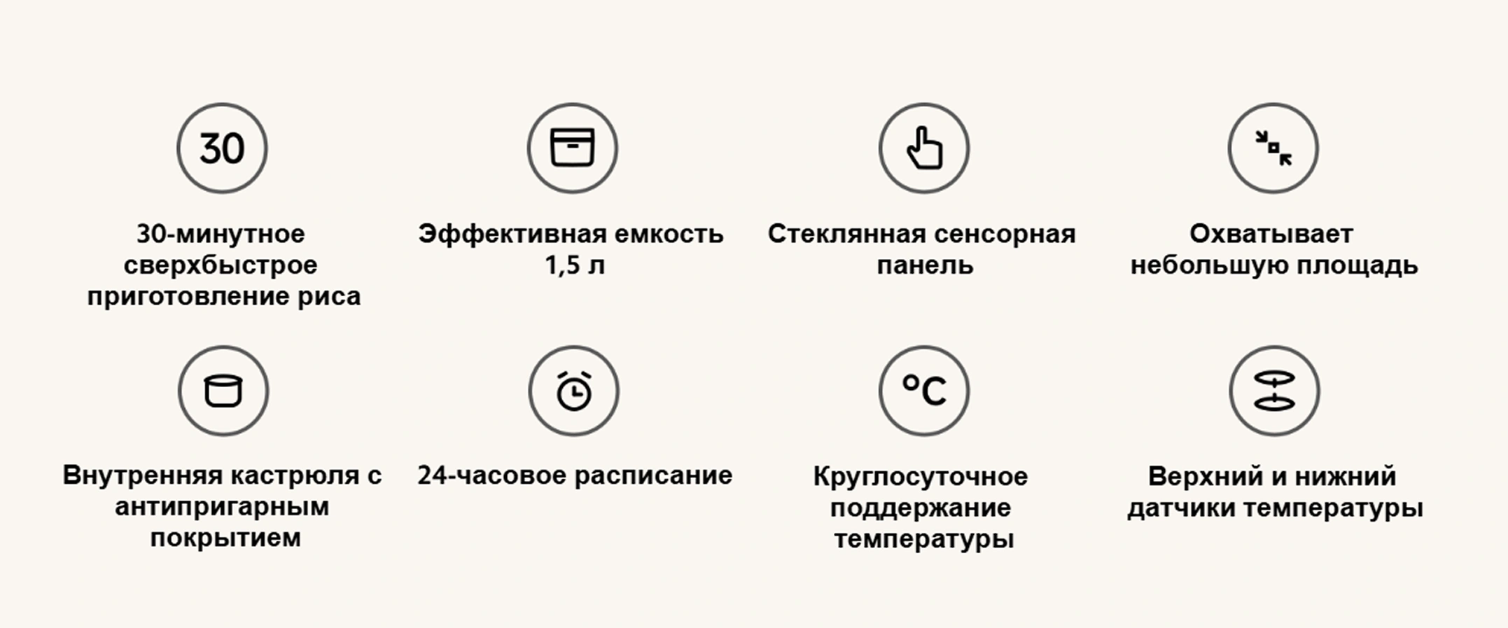 Yuqori va pastki harorat datchiklari pishirish haroratini doimiy ravishda kuzatib boradi va guruchning qaynab ketishiga yo‘l qo‘ymaslik uchun quvvatni avtomatik ravishda sozlaydi.
