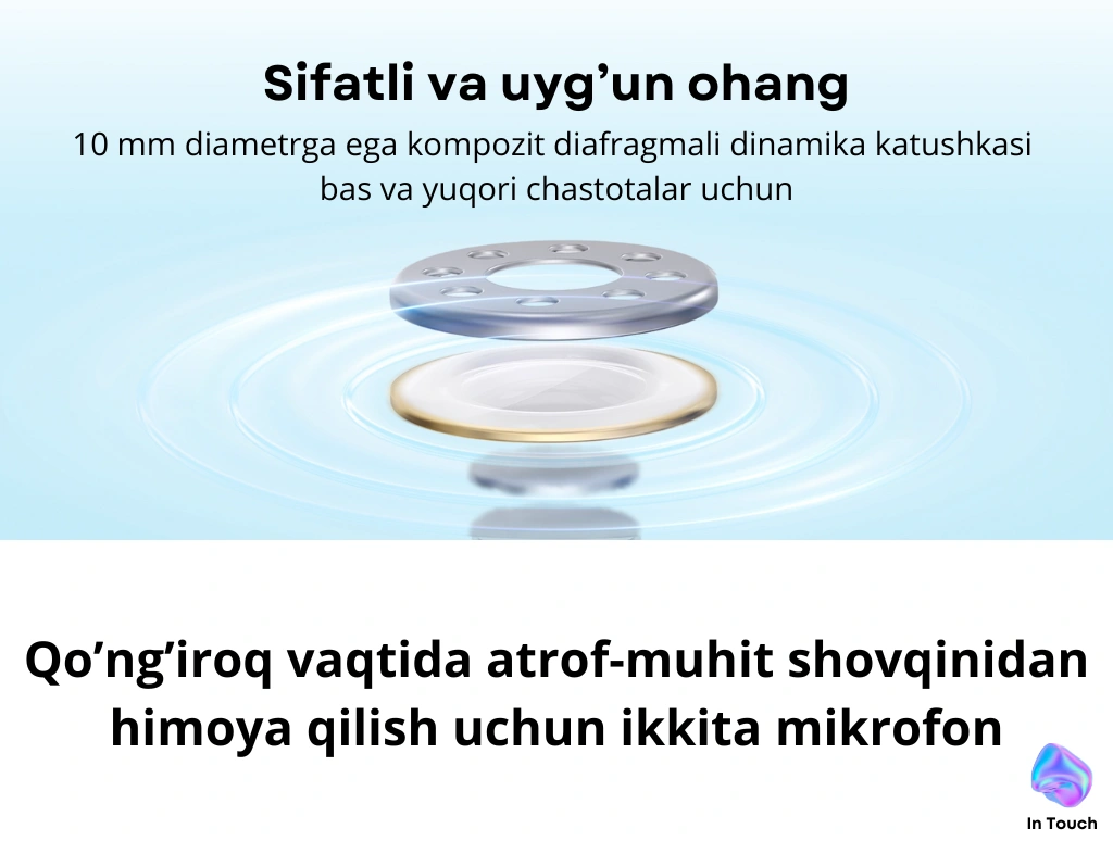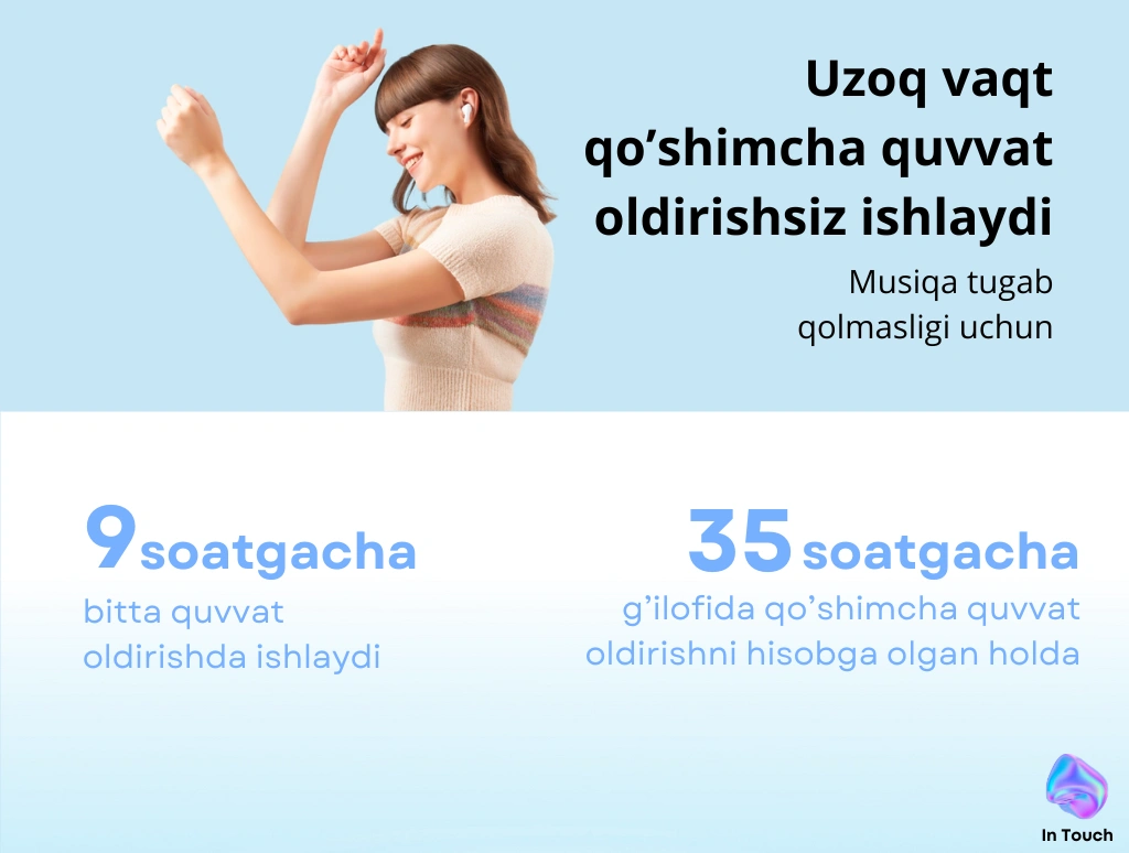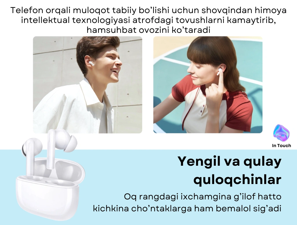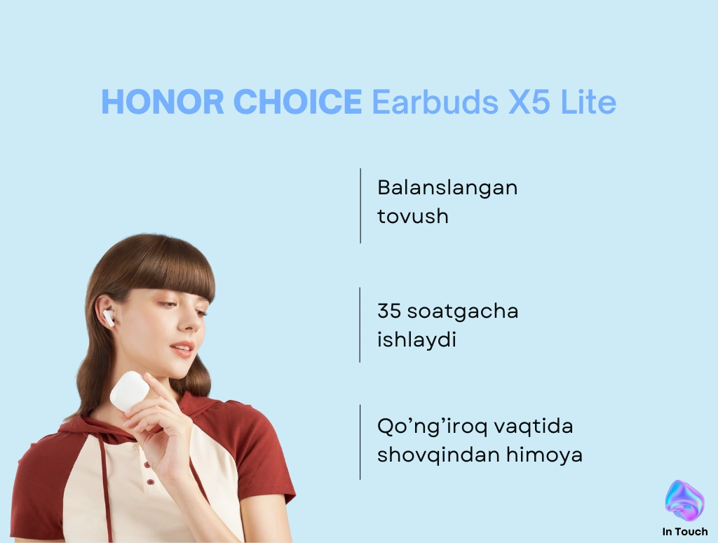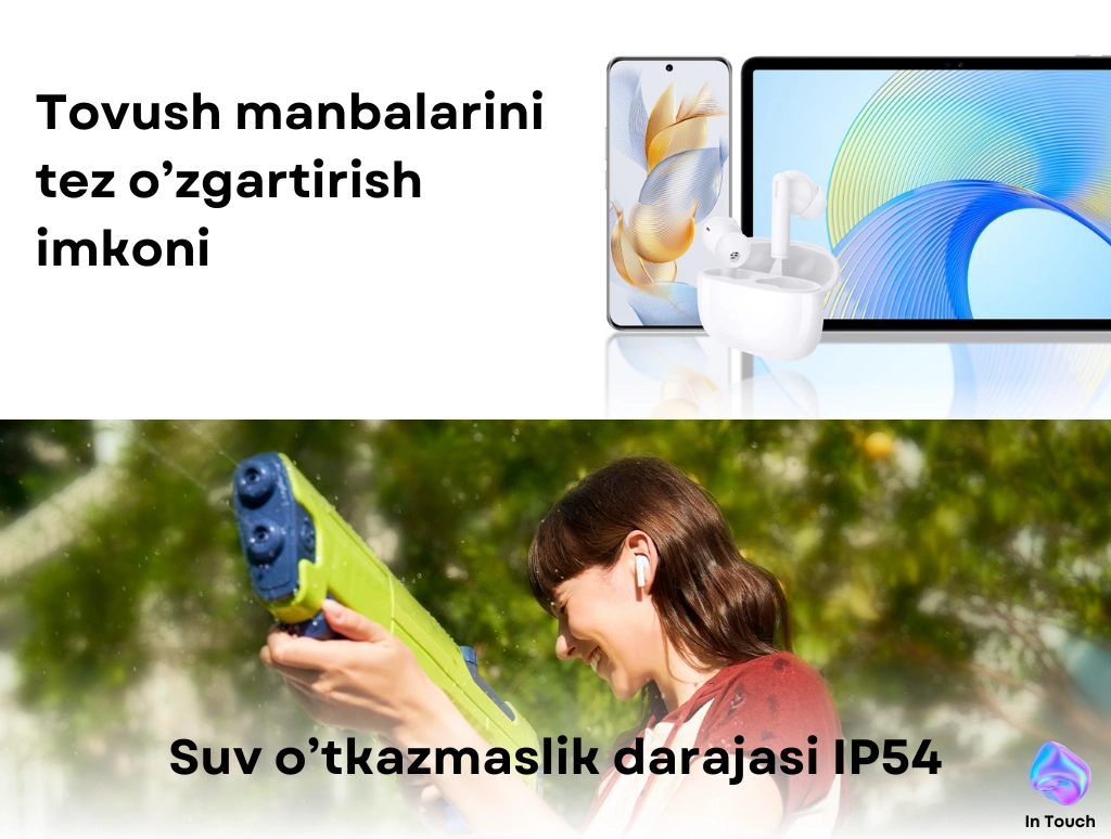 O‘zingiz uchun Honor Choice Earbuds X5 simsiz quloqchinlar bilan yangi imkoniyatlarni oching va har qanday holatda tovushning yuksak sifatidan lazzatlaning! Honor quloqchinlarini hoziroq In Touch do‘konidan xarid qilish mumkin.