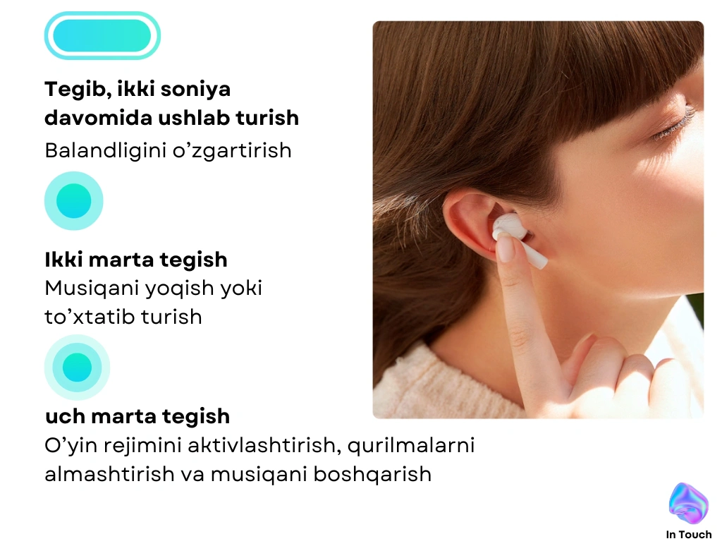 - Ikki marta teginish - musiqani ijro etish yoki pauza, kiruvchi qo‘ng‘iroqqa javob berish yoki qo‘ng‘iroqni yakunlash, ovozli yordamchini faollashtirish.