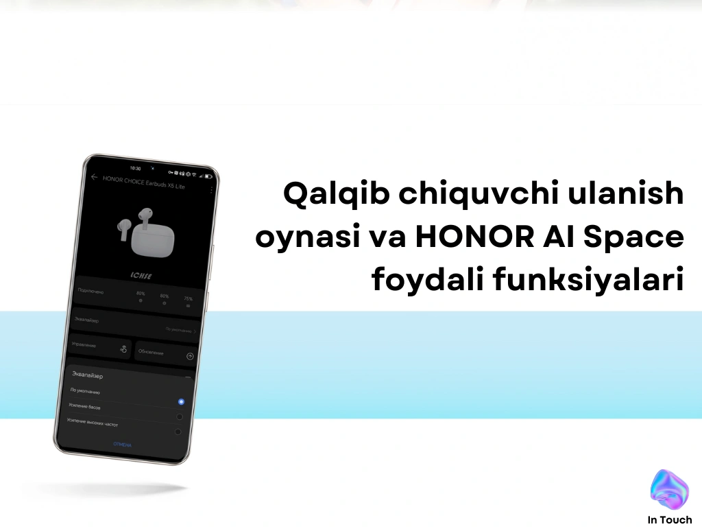 Quvvatlash keysini ochib, siz ulanish haqidagi ma’lumotga ega bo‘lgan smartfoningizni ekranida qulay sizib chiquvchi darchani ko‘rasiz. HONOR AI Space ilovasida quloqchinlarni qo‘shimcha sozlamalari va ularni dasturiy ta’minotini yangilanishlari erishimli, bu ularni qo‘llanilishini yanada ancha funksional va qulay qiladi.