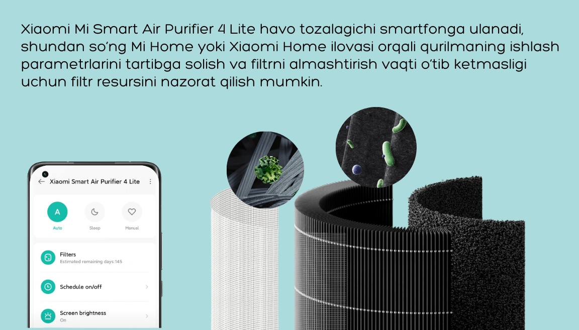 Xiaomi Mi Smart Air Purifier 4 Lite havo tozalagichi – bu hayotida hech qanday yoqimsiz hidlarsiz va mayda chang yoki gul changi zarralarisiz faqat toza havodan nafas olishni istagan kishilar uchun imkonli va ishonchli yechim. Yangi modelning afzalliklaridan bugunning o‘zidayoq foydalanishni boshlang!