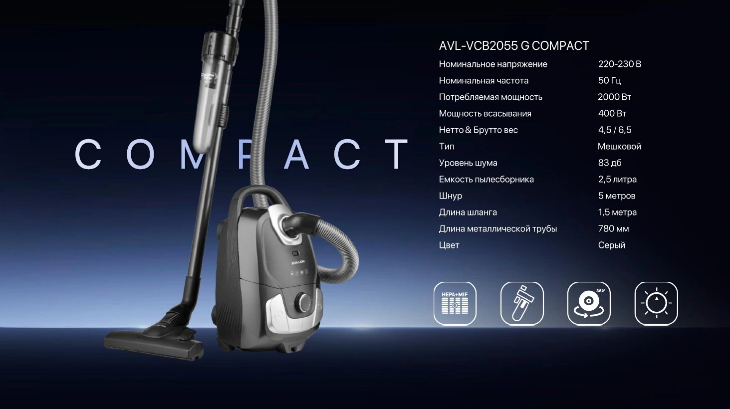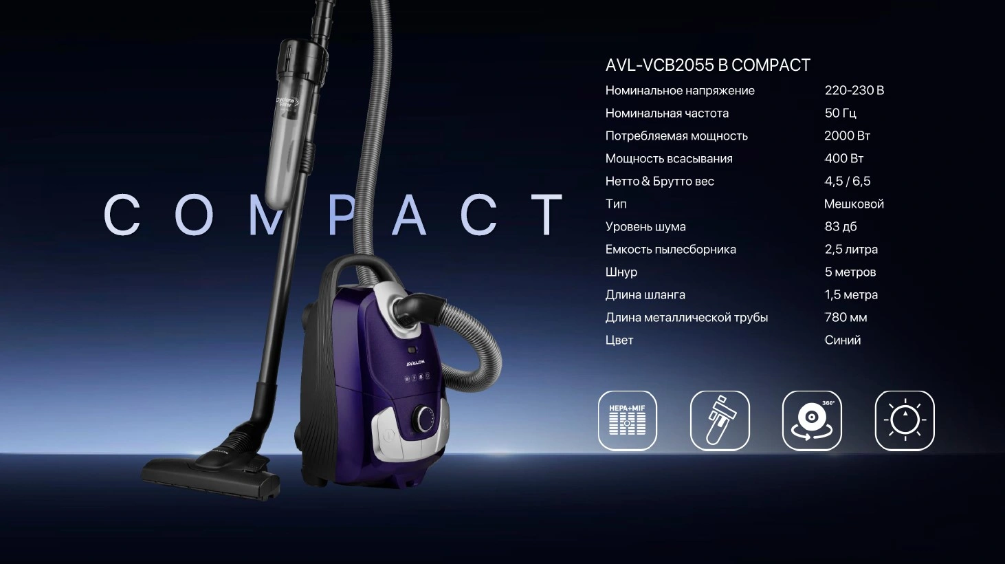 AVALON AVL-VCB2055 COMPACT changyutgichi - bu quvvat, samaradorlik va qulaylikning uyg‘unligidir. U uyingizda havoning tozaligi va musaffoligini ta’minlovchi beqiyos yordamchingizga aylanadi.