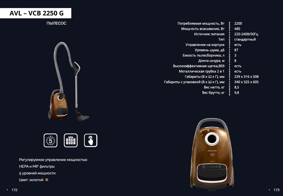 Changyutgich AVALON - uyda to'liq tozalash uchun ishonchli va funktsional qurilma. Model yengil vazni va 480 Vt yuqori tortish quvvati bilan ajralib turadi, bu sizga gilam va qattiq yuzalarni yuqori sifatli tozalash imkonini beradi. Qurilma 220 V kuchlanishli tarmoqda ishlaydi.