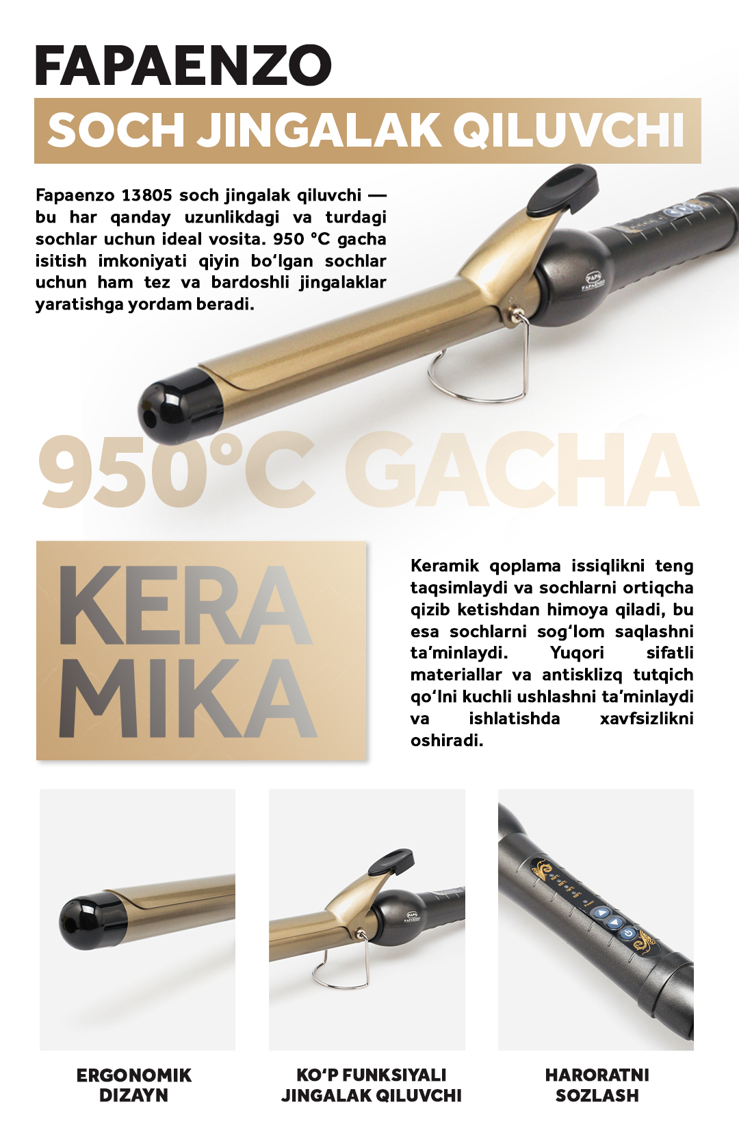 Fapaenzo 13805 soch jingalak qiluvchi — bu har qanday uzunlikdagi va turdagi sochlar uchun ideal vosita. 950 °C gacha isitish imkoniyati qiyin bo‘lgan sochlar uchun ham tez va bardoshli jingalaklar yaratishga yordam beradi.