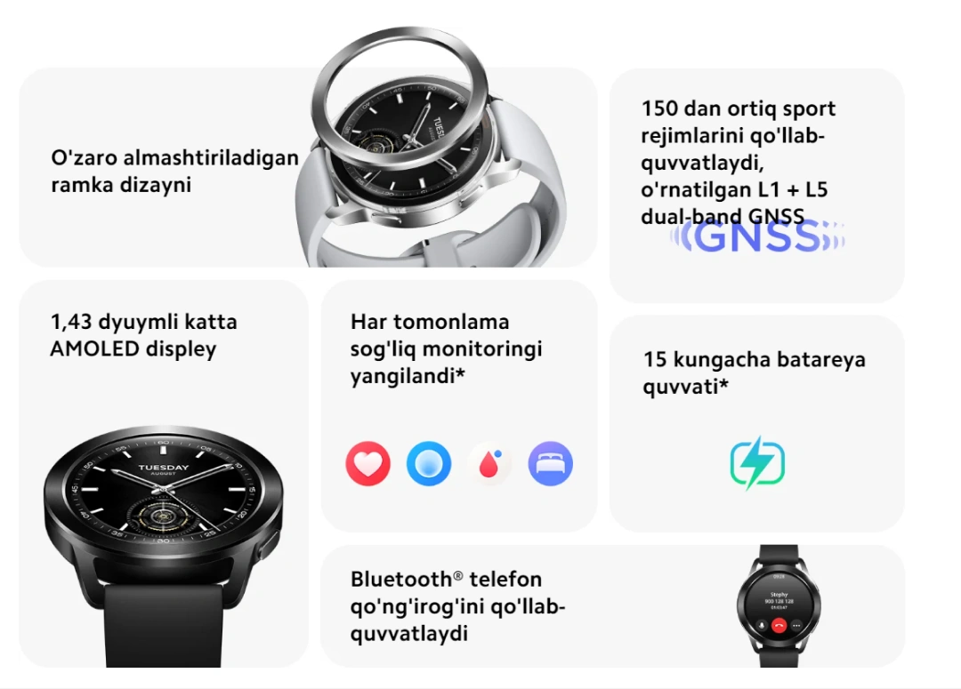 Xiaomi Watch S3 an’anaviy soatlardan ilhom oladi va yuqori sifatli materiallardan tayyorlangan bo‘lib, har bir dizaynda o‘zining g‘ayrioddiy uslubini namoyish etib, dizaynning qulayligi va nafisligini ta’minlaydi.
