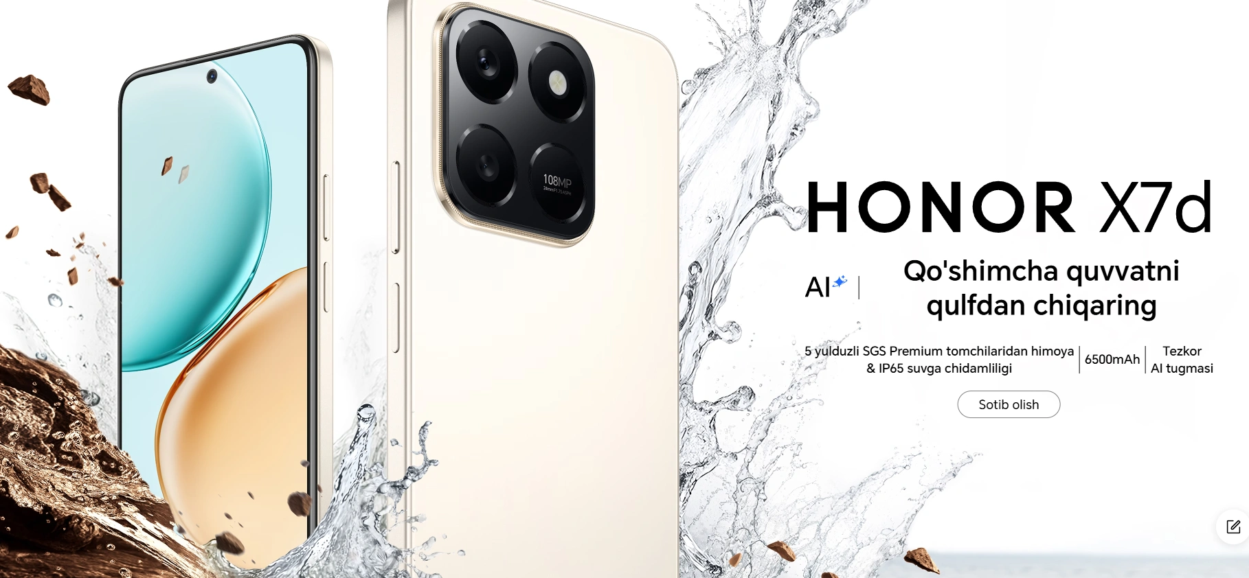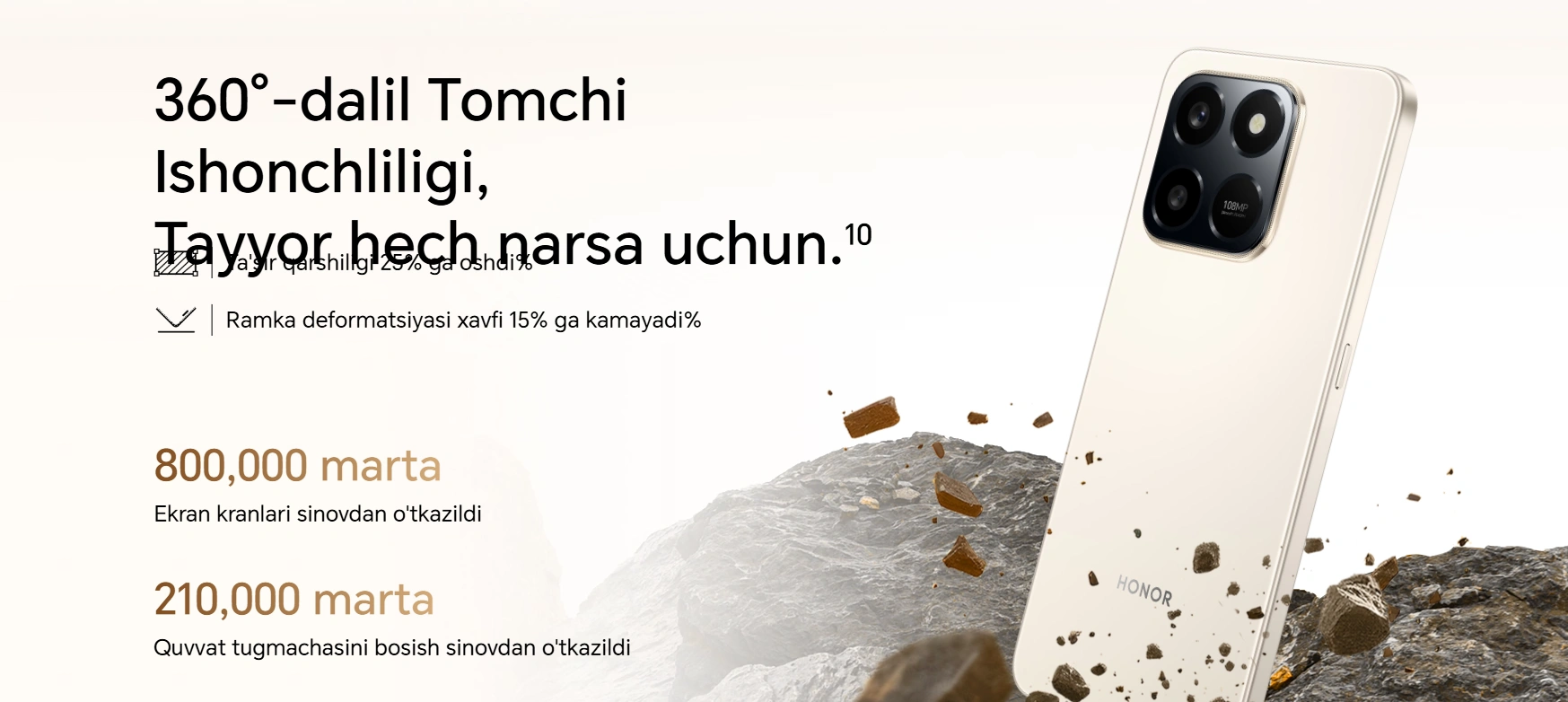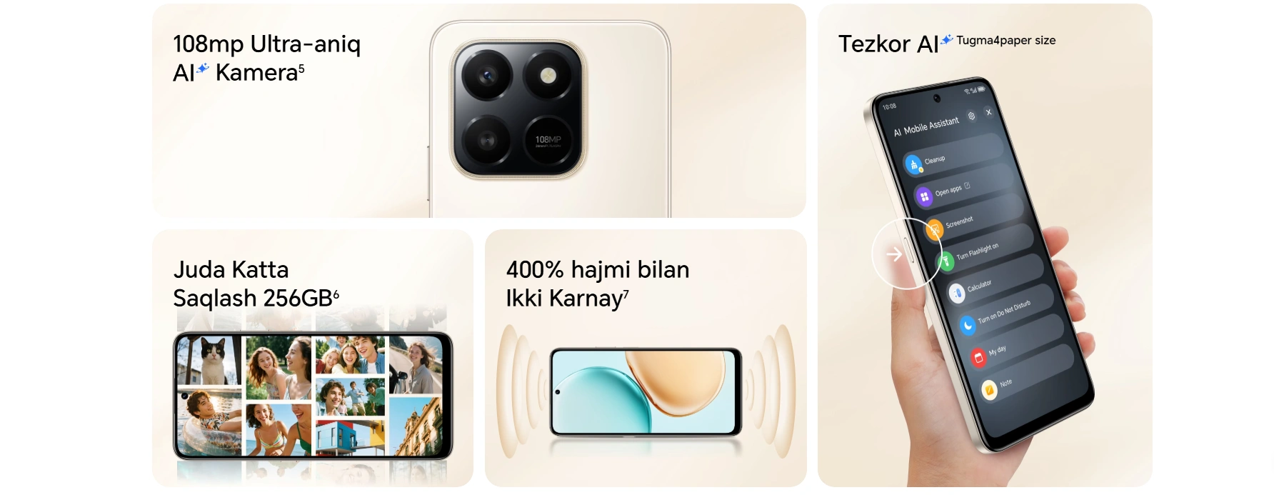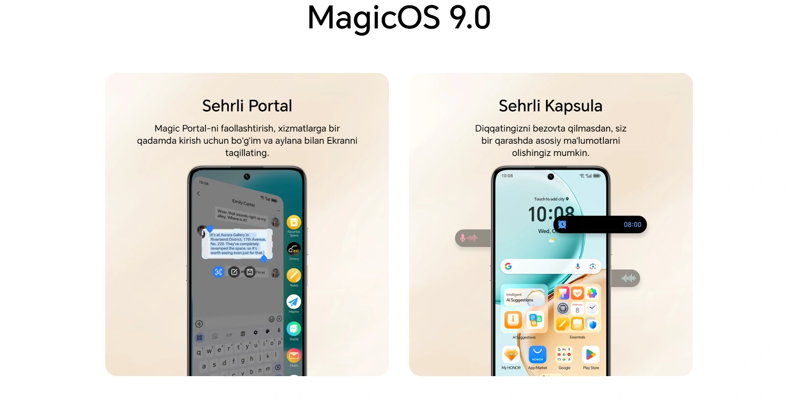 - 🤖 MagicOS 9.0 (Android 15) — AI tugmasi va HONOR Connect ilovasi orqali tezkor ma’lumot almashish.