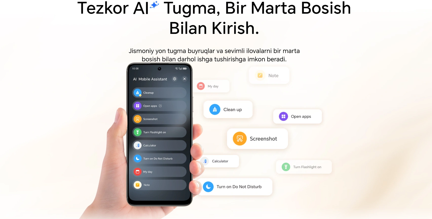 - 📸 Kameralar: asosiy 108 Mp + 2 Mp, old kamera 8 Mp, sun’iy intellekt imkoniyatlari bilan.