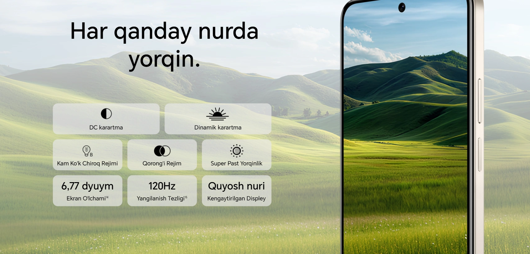- 📱 6,77” IPS displey — 120 Gts yangilanish chastotasi, 850 nitgacha yorqinlik va ko‘k nur filtri.