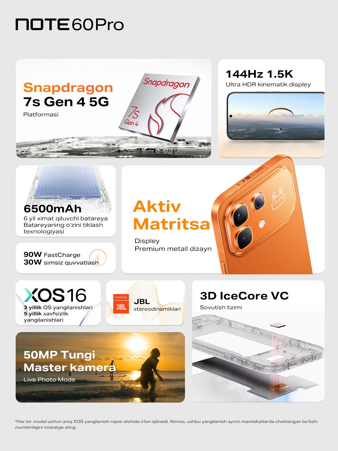 - 🧠 Smartfon Android 16 asosidagi XOS 16 operatsion tizimida ishlaydi.
