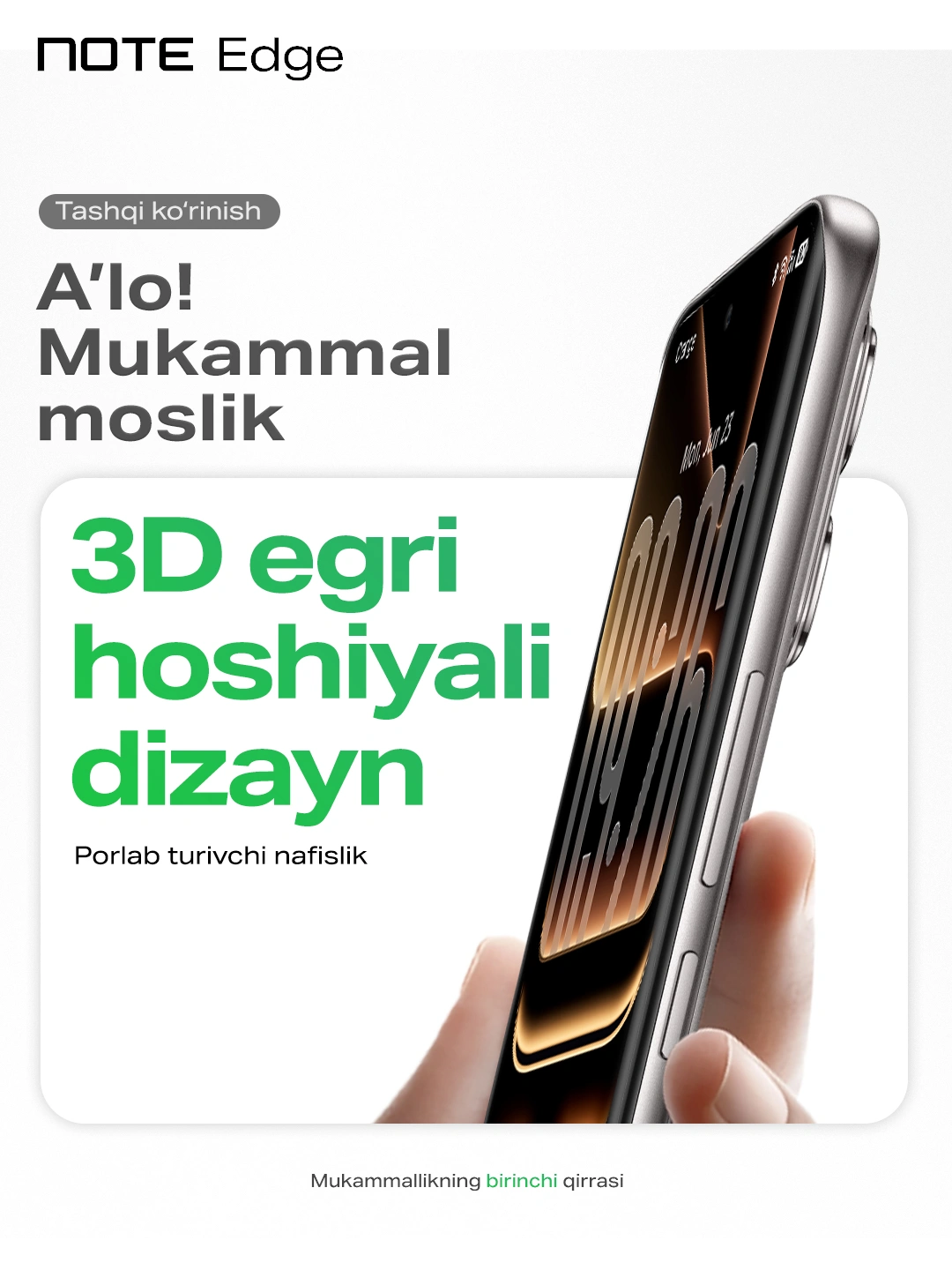3D egri hoshiyali ekran smartfonga nafis ko‘rinish beradi va kontentni yanada immersiv qiladi.