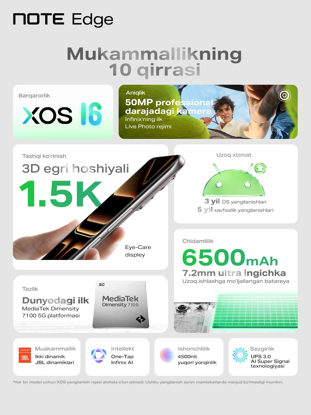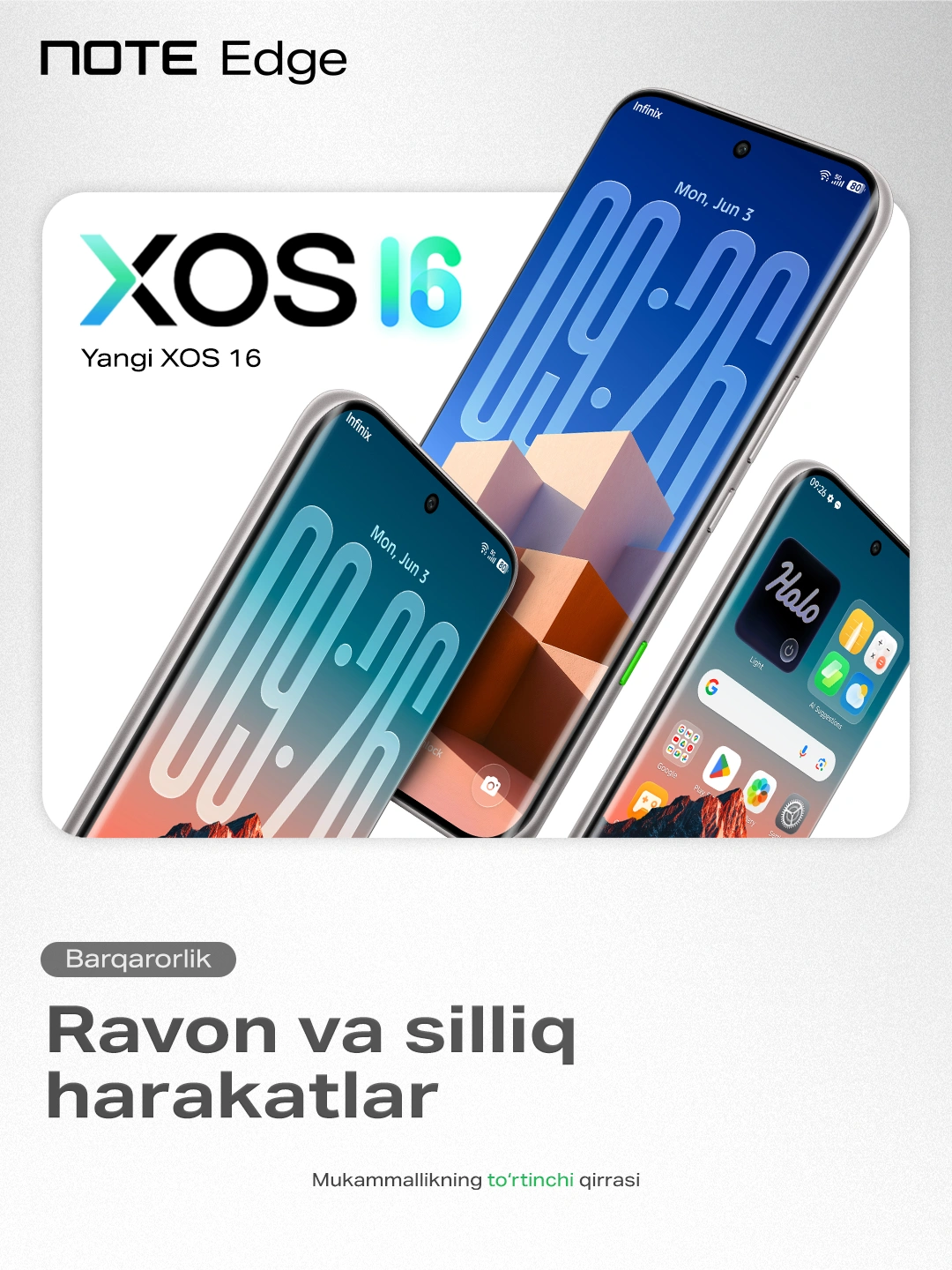 Aqlli XOS 16 tizimi- Smartfon Android 16 asosidagi XOS 16 operatsion tizimida ishlaydi.