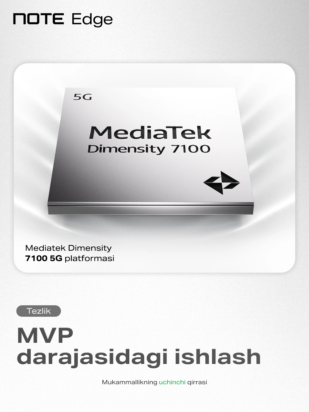 Kuchli ishlash- Smartfon MediaTek Dimensity 7100 protsessori bilan ishlaydi. U 6nm texnologiya asosida ishlab chiqilgan bo‘lib, yuqori tezlik va energiya samaradorligini ta’minlaydi.