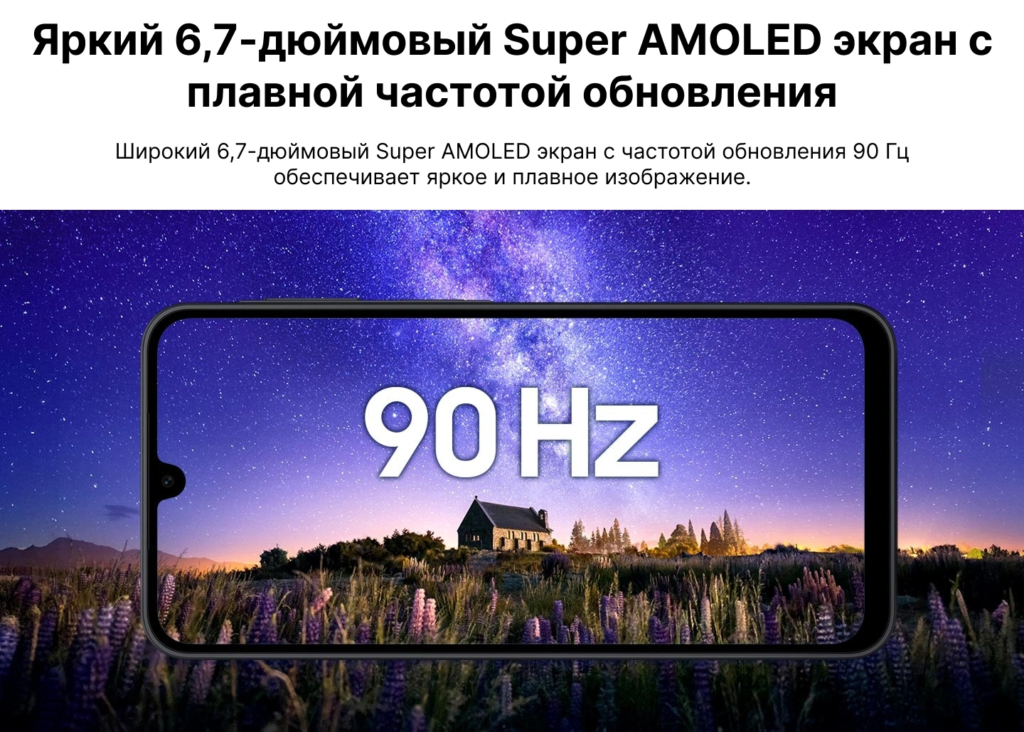 6.7 dyuymli Super AMOLED ekran jonli ranglar va chuqur kontrastni ta’minlaydi. 90 Hz yangilanish tezligi esa interfeysni silliq va yoqimli qiladi.