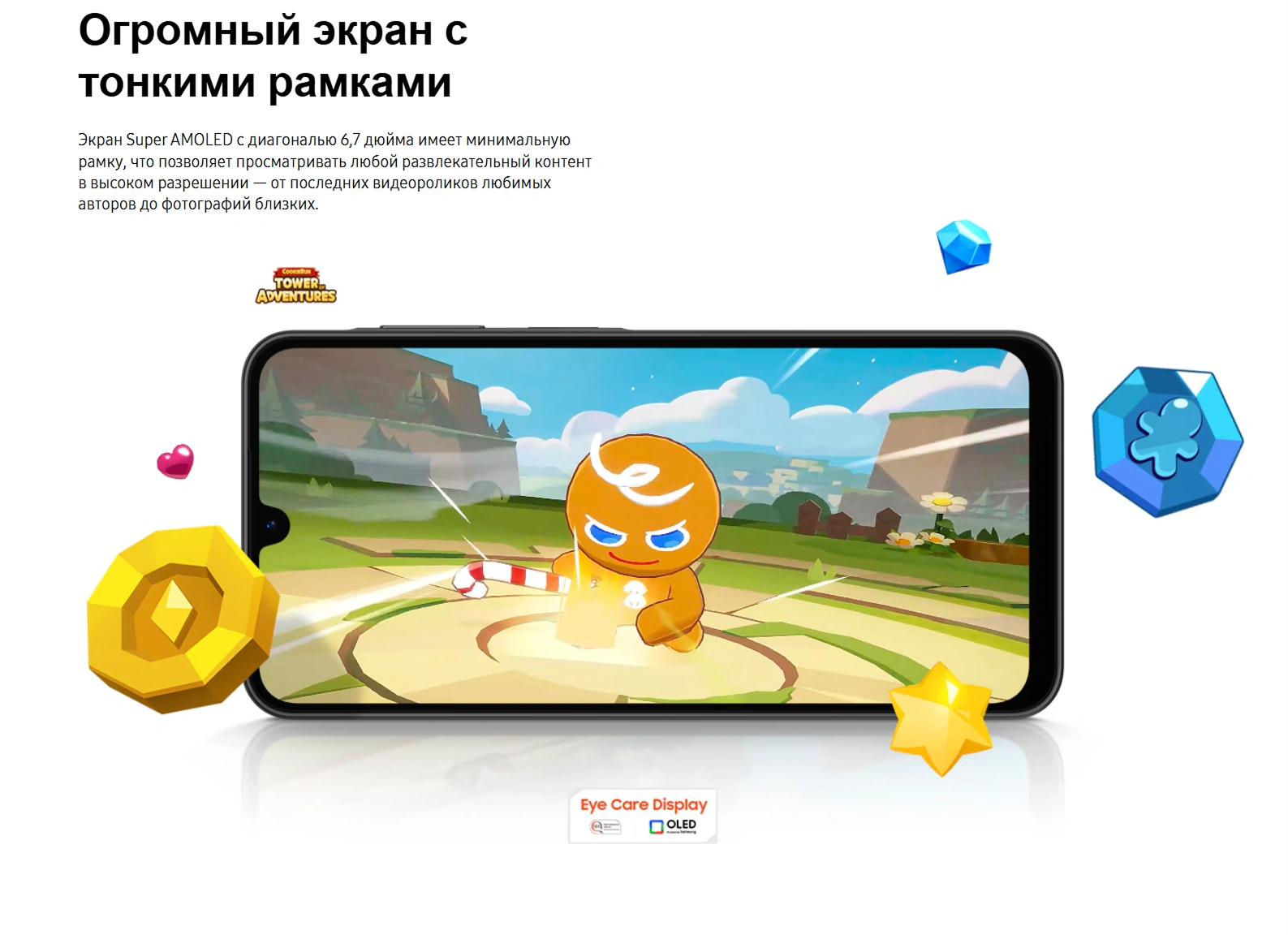 Смартфон получил 6,7-дюймовый Super AMOLED дисплей с разрешением 1080×2340 пикселей, частотой обновления 120 Гц и поддержкой Always-on Display. Благодаря Gorilla Glass Victus+, экран устойчив к царапинам и ударам, а высокое качество изображения обеспечит комфортный просмотр контента.