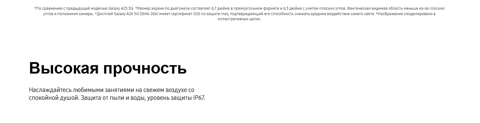Galaxy A26 оснащен стеклянной передней и задней панелью Gorilla Glass Victus+ и прочной пластиковой рамкой. Он соответствует стандарту IP67, что обеспечивает защиту от пыли и воды (до 1 метра на 30 минут). Компактные размеры 164 x 77,5 x 7,7 мм и вес 200 г делают устройство удобным в использовании.