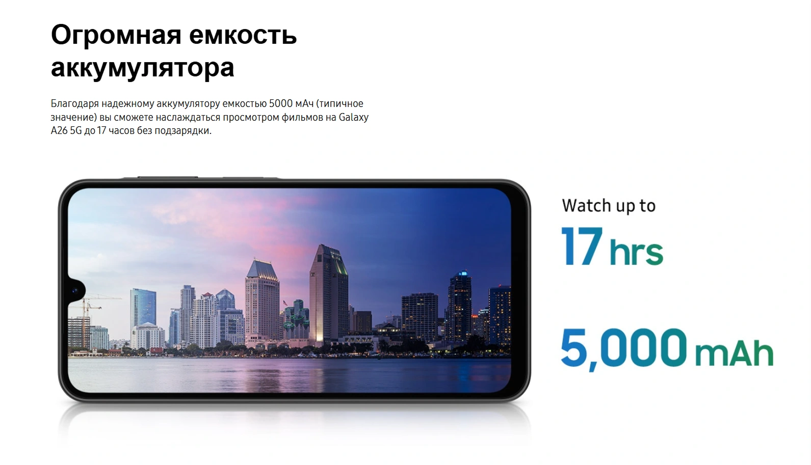 Galaxy A26 оснащен аккумулятором 5000 мАч, обеспечивающим долгую автономную работу. Поддержка быстрой зарядки 25 Вт позволит быстро пополнить заряд.