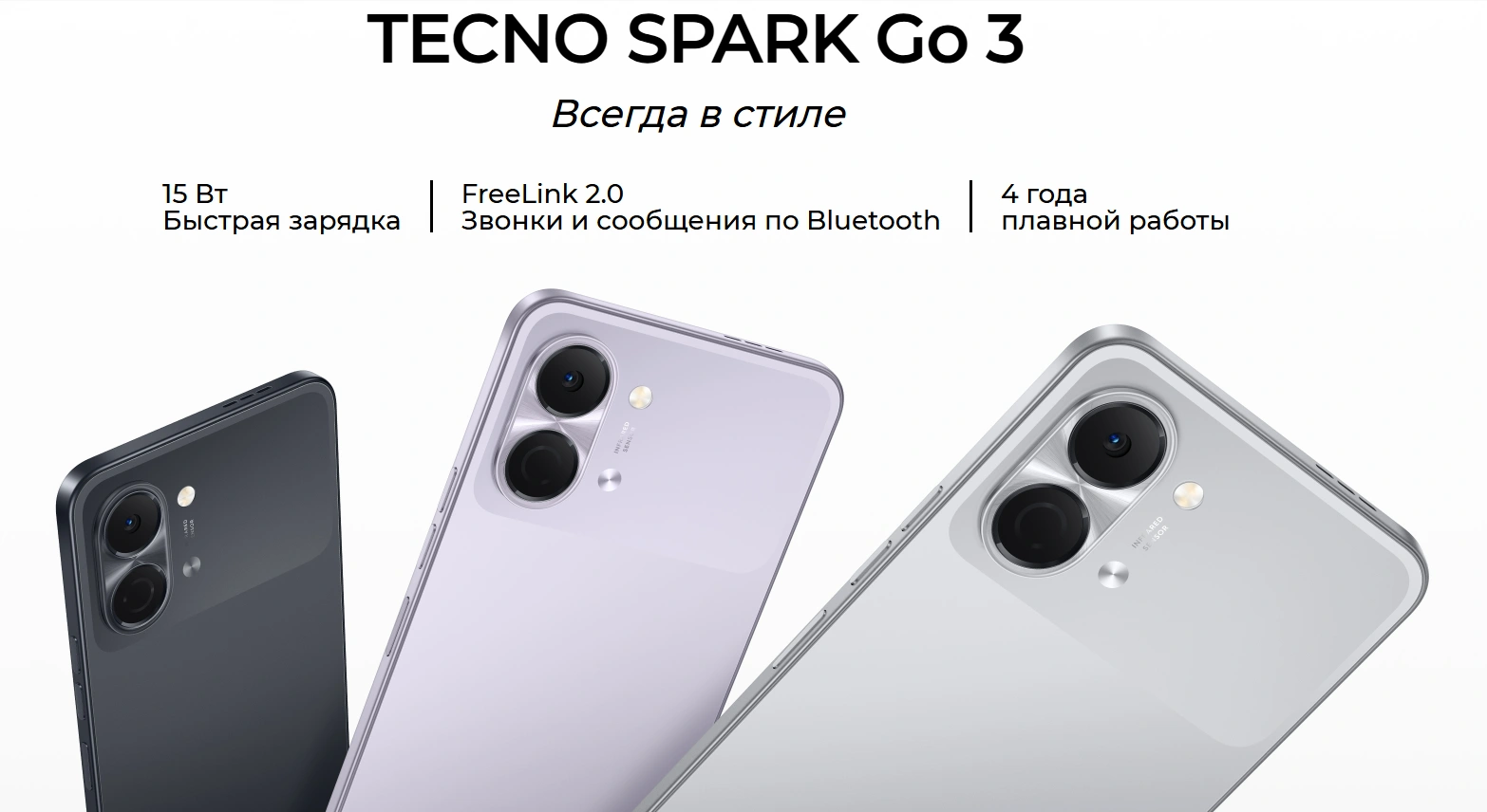 — bu zamonaviy smartfon bo‘lib, u oqilona narxda maksimal imkoniyatlarni xohlaydiganlar uchun yaratilgan. Qurilma zamonaviy dizayn, 120 Gts chastotali katta va silliq ekran, kuchli UNISOC T7250 sakkiz yadroli protsessor hamda 5000 mAh sig‘imli akkumulyatorni o‘zida jamlaydi. Android 15 operatsion tizimi tufayli smartfon tez va barqaror ishlaydi, xavfsizlik hamda qulaylik bo‘yicha eng yangi funksiyalarni taqdim etadi. TECNO SPARK Go 3 muloqot, ish, ko‘ngilochar dasturlar, o‘yinlar, video tomosha qilish va ijtimoiy tarmoqlar uchun juda mos keladi. Smartfon kundalik vazifalarni osonlashtiruvchi AI-funksiyalar bilan jihozlangan: fotosuratlarni tahrirlash, matn yaratish va tarjima qilish imkoniyatlari mavjud. 6.75 dyuymli katta displey foydalanishni qulay qiladi, 120 Gts yangilanish chastotasi esa sahifalarni silliq aylantirish, yoqimli animatsiyalar va har qanday ilovada yuqori vizual tajribani ta’minlaydi. AI qo‘llab-quvvatlovchi 13 MP kamera hatto kam yorug‘lik sharoitida ham tiniq va yorqin suratlar olishga yordam beradi, 8 MP old kamera esa selfi va videoqo‘ng‘iroqlar uchun juda qulay. TECNO SPARK Go 3 FreeLink 2.0 texnologiyasini qo‘llab-quvvatlaydi, bu esa tarmoq signali zaif bo‘lsa ham Bluetooth orqali qo‘ng‘iroq qilish va xabar almashish imkonini beradi. Bu sayohatlarda, uzoq hududlarda yoki oddiy aloqa ishlamaydigan vaziyatlarda juda foydali. Smartfon IP64 darajadagi chang va namlikdan himoyaga ega bo‘lib, uni kundalik sharoitlarda yanada ishonchli qiladi. Qo‘shimcha afzallik sifatida infraqizil port mavjud bo‘lib, smartfonni maishiy texnika uchun pultga aylantiradi. Yon tomondagi barmoq izi skaneri tezkor qulfdan chiqarish va ma’lumotlar xavfsizligini ta’minlaydi. 15 Vtgacha tezkor quvvatlash va USB Type-C porti quvvatlash jarayonini zamonaviy va qulay qiladi. TECNO SPARK Go 3 unumdorlik, uzoq ishlash, qulaylik va zamonaviy texnologiyalarni birlashtirgan smartfon hisoblanadi.