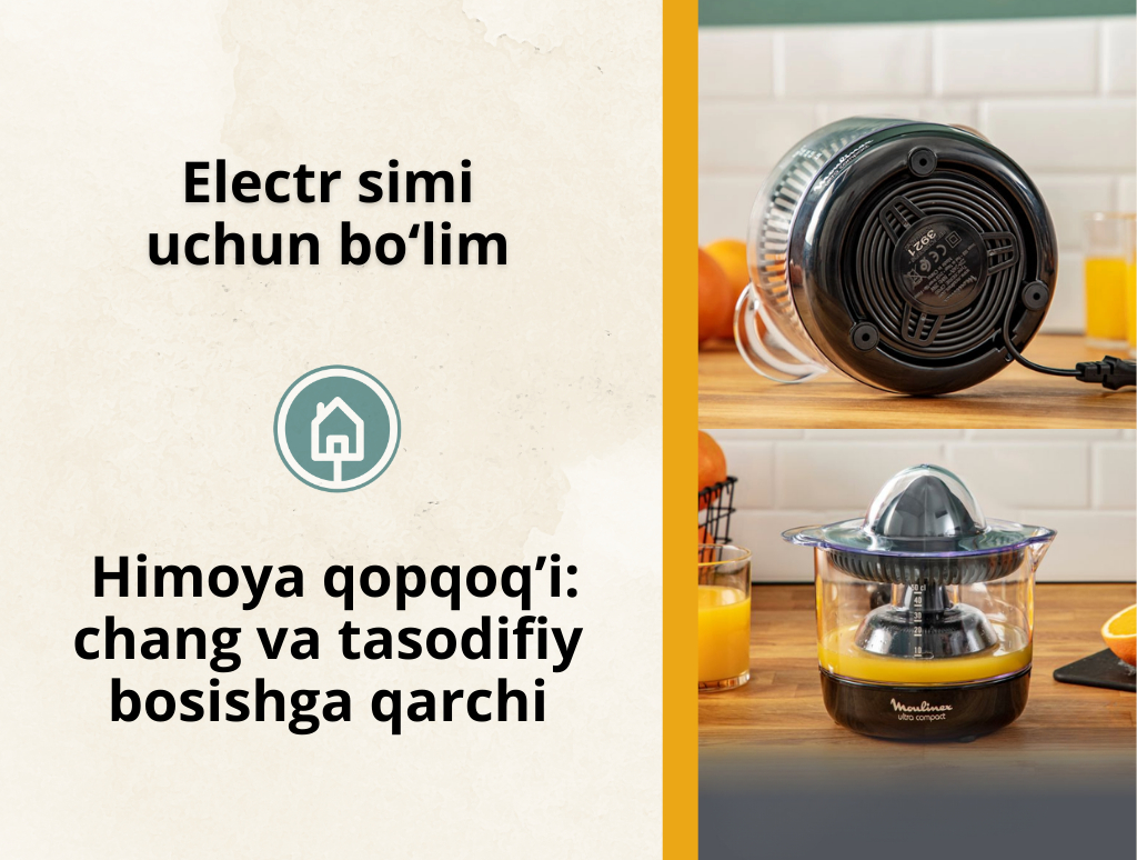 Ayollarga sovgʻa izlayapsizmi? Moulinex Ultra Compact sitrus mevalari uchun sharbat siqish mashinasi – ayollarga sovgʻa qilish uchun ajoyib variant, u uzoq yillar davomida xizmat qiladi. Oʻzbekistonda Moulinex sharbat siqish mashinasini hamyonbop narxda “Умный Дом” doʻkonida xarid qilish mumkin. Manfaatli narxda yuqori sifatni tanlang!