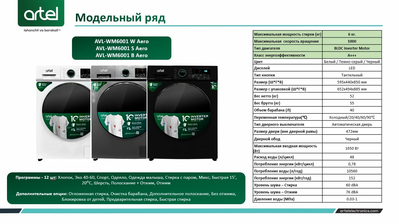 ARTEL kir yuvish mashinalari nafis dizayn va ilg'or texnologiyalarni o'zida mujassam etgan. Ushbu kir yuvish mashinasi A+++ energiya samaradorligi darajasiga ega. Kirlarni samarali tozalash va yuvish uchun mo'ljallangan. Ushbu model innovatsion BLDC inverter motoriga ega. U uzoq muddat ishlash, elektr energiyasini tejash hamda shovqinsiz ishlash uchun mo'ljallangan.