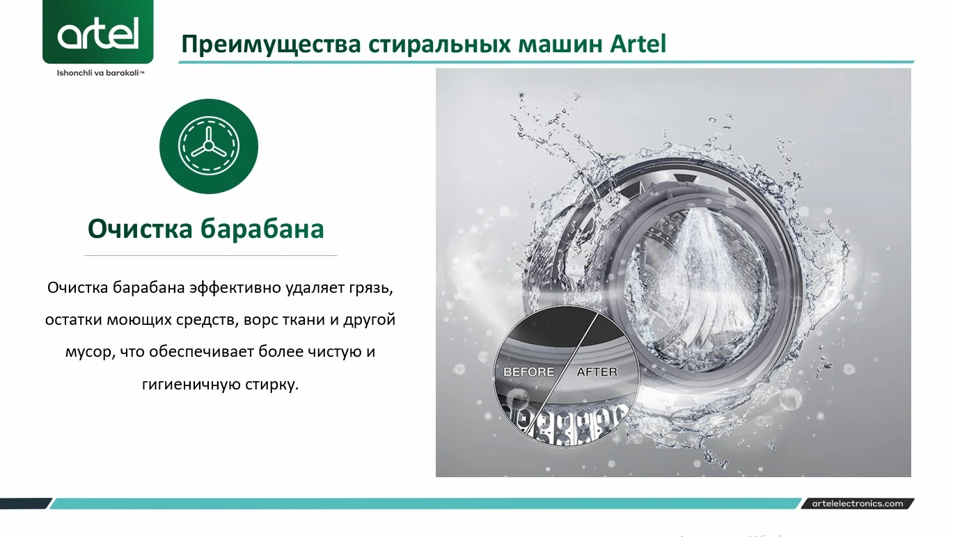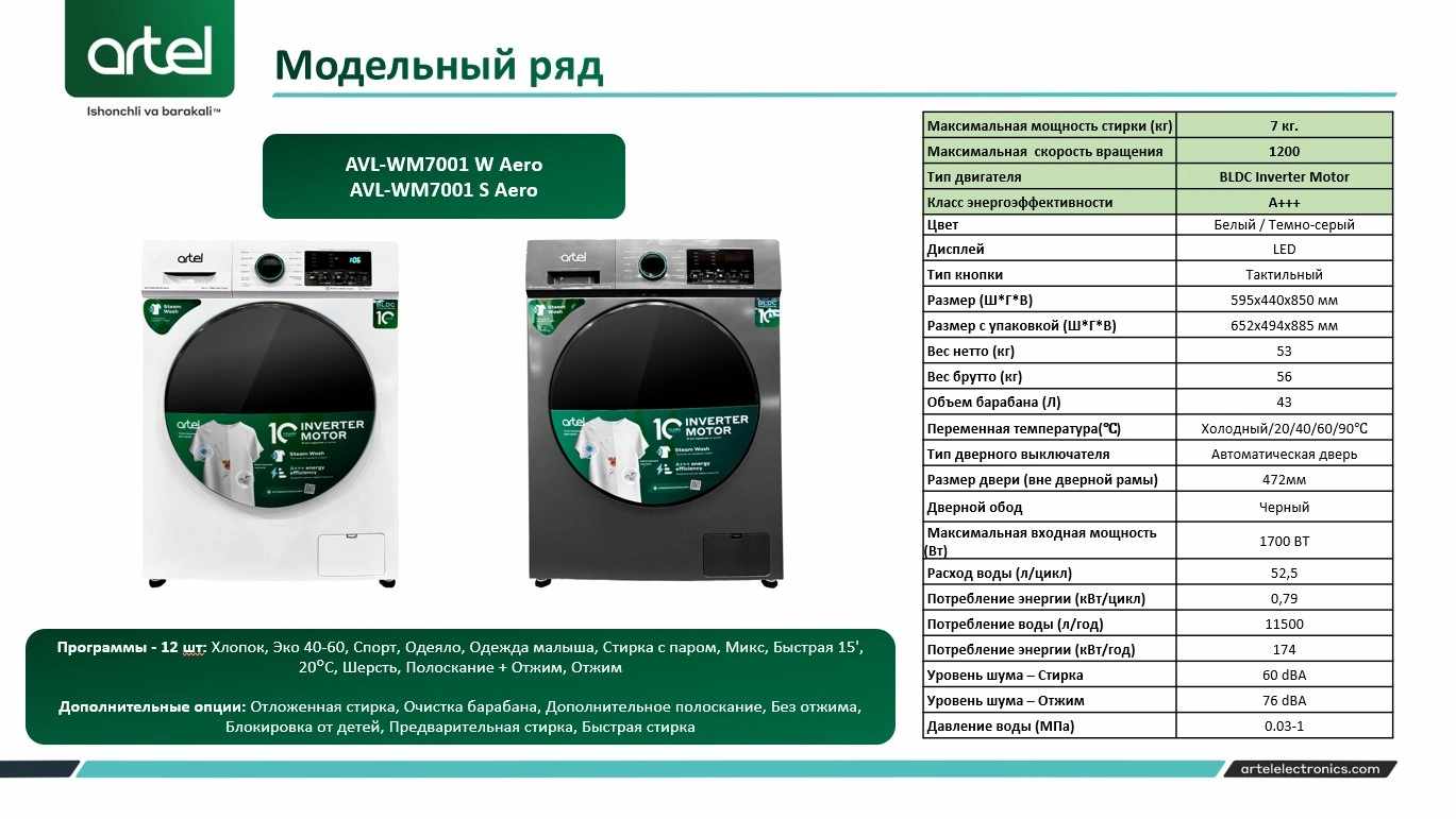 ARTEL kir yuvish mashinalari nafis dizayn va ilg'or texnologiyalarni o'zida mujassam etgan. Ushbu kir yuvish mashinasi A+++ energiya samaradorligi darajasiga ega. Kirlarni samarali tozalash va yuvish uchun mo'ljallangan. Ushbu model innovatsion BLDC inverter motoriga ega. U uzoq muddat ishlash, elektr energiyasini tejash hamda shovqinsiz ishlash uchun mo'ljallangan.