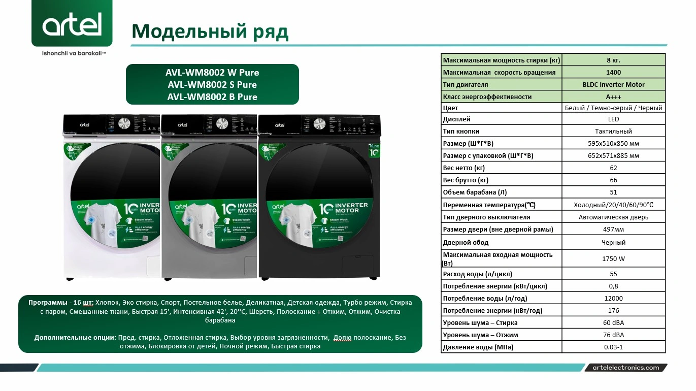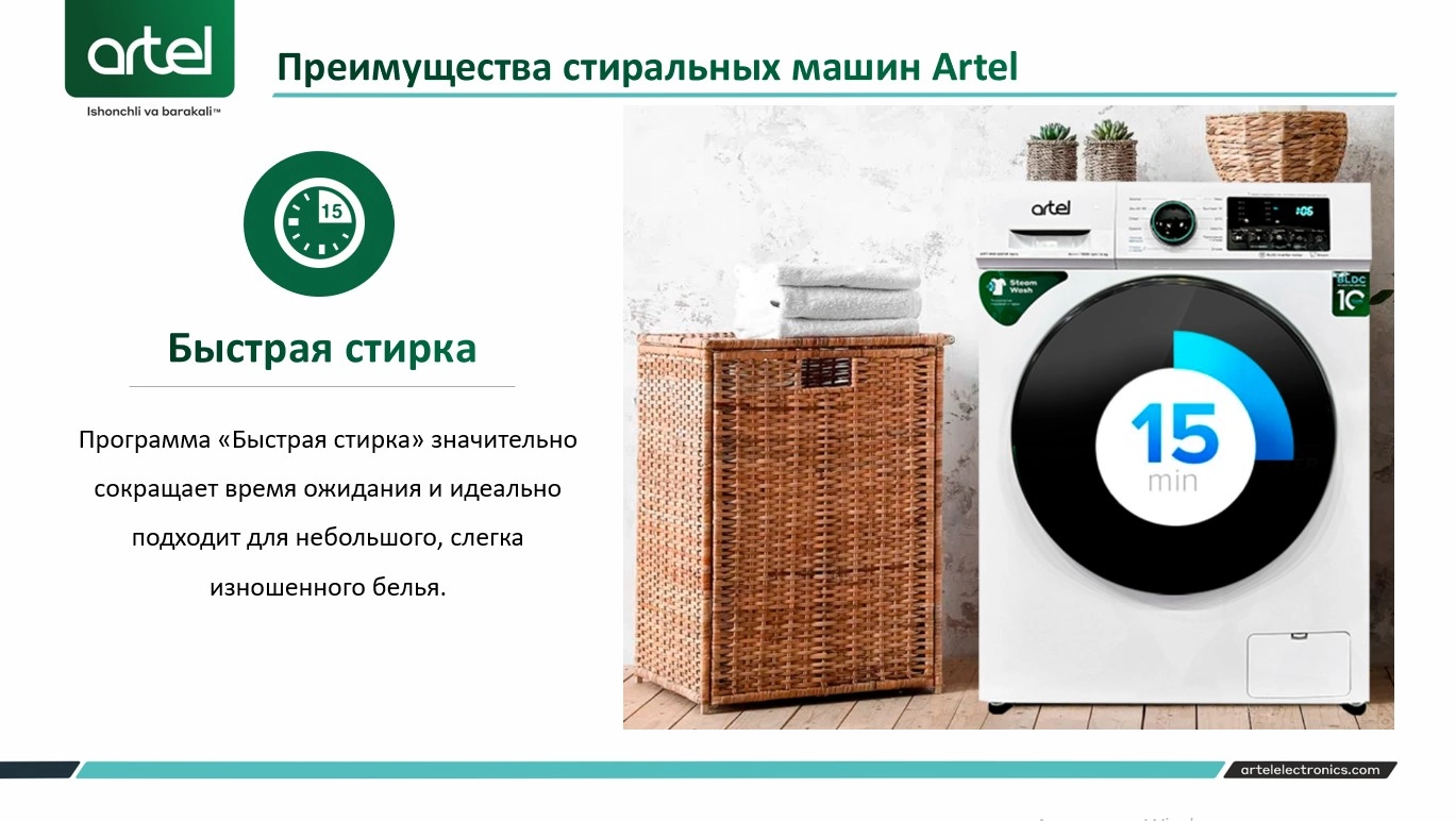 ARTEL kir yuvish mashinalari nafis dizayn va ilg'or texnologiyalarni o'zida mujassam etgan. Ushbu kir yuvish mashinasi A+++ energiya samaradorligi darajasiga ega. Kirlarni samarali tozalash va yuvish uchun mo'ljallangan. Ushbu model innovatsion BLDC inverter motoriga ega. U uzoq muddat ishlash, elektr energiyasini tejash hamda shovqinsiz ishlash uchun mo'ljallangan.