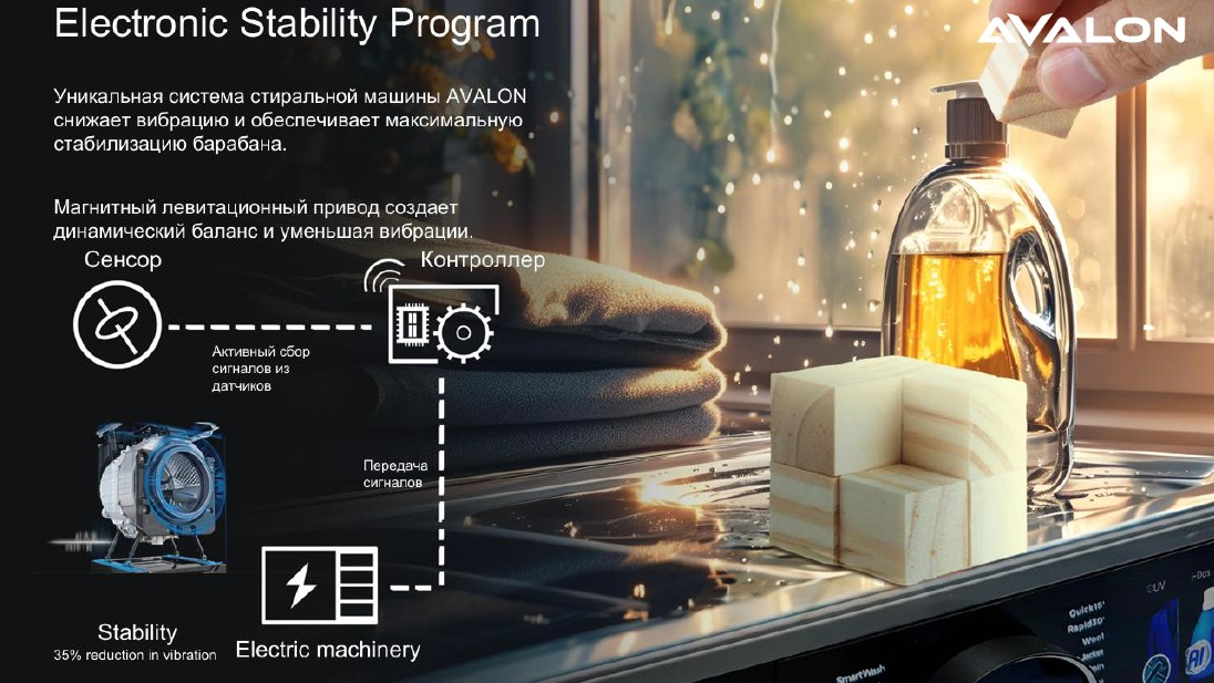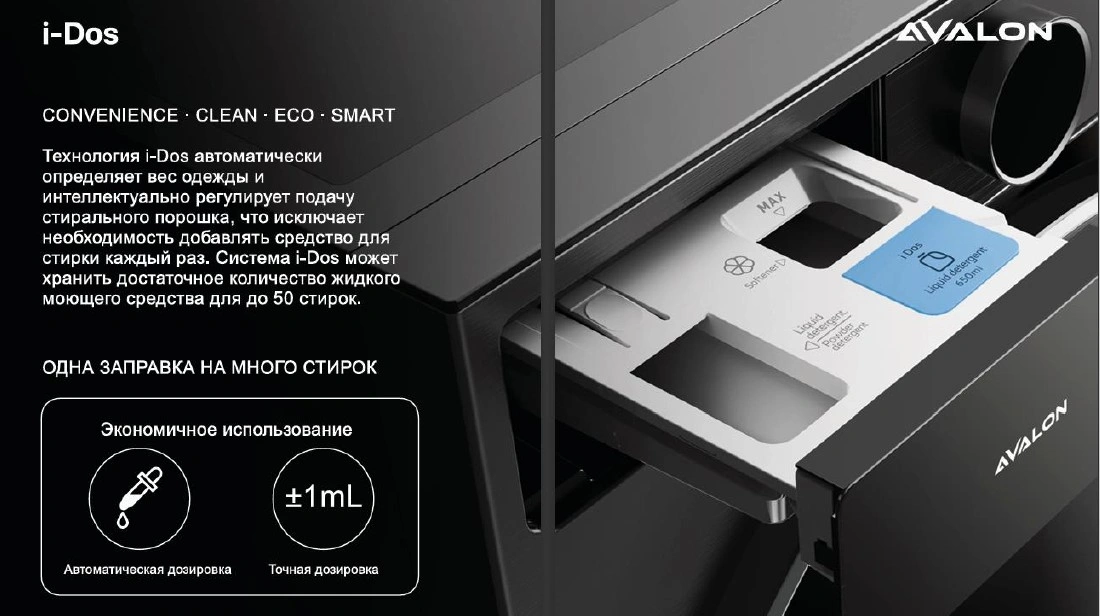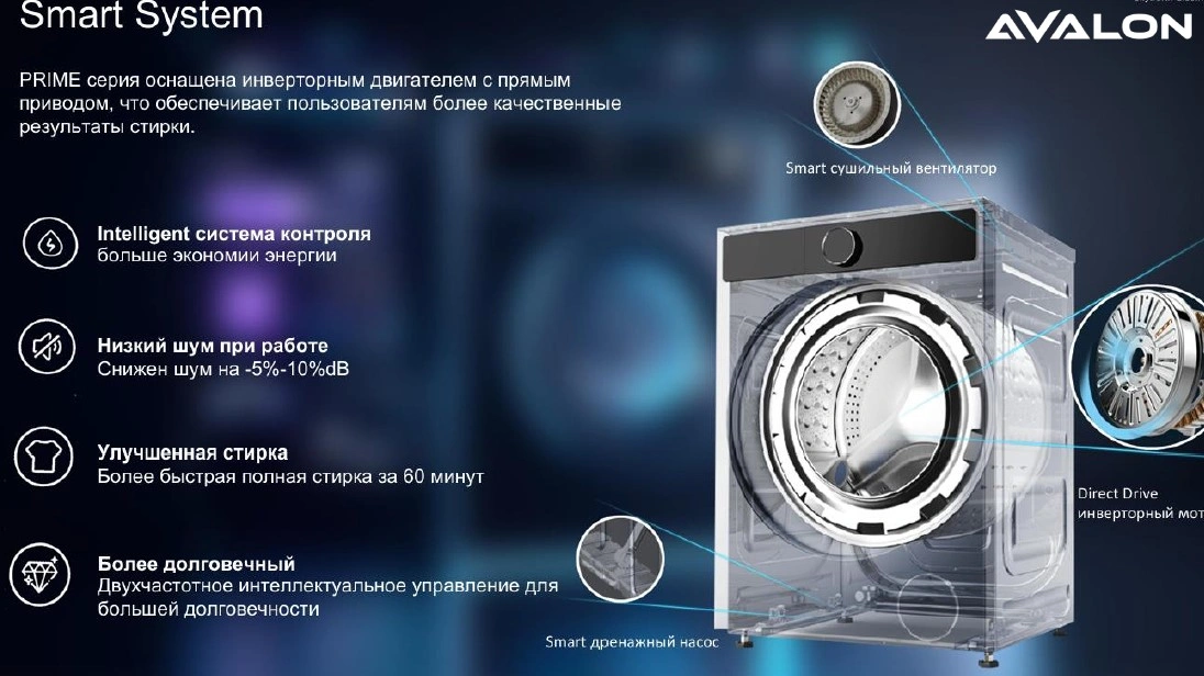 AVALON kir yuvish mashinalari nafis dizayn va ilg'or texnologiyalarni o'zida mujassam etgan. Ushbu kir yuvish mashinasi A+++ energiya samaradorligi darajasiga ega. Kirlarni samarali tozalash va yuvish uchun mo'ljallangan. Ushbu model innovatsion DD inverter motoriga ega. U uzoq muddat ishlash, elektr energiyasini tejash hamda shovqinsiz ishlash uchun mo'ljallangan.