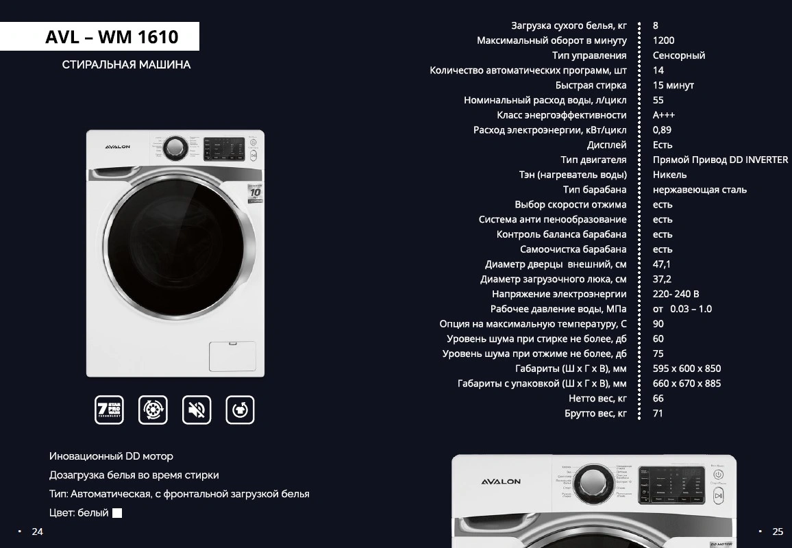 Avalon kir yuvish mashinalari nafis dizayn va ilg'or texnologiyalarni o'zida mujassam etgan. Ushbu kir yuvish mashinasi A+++ energiya samaradorligi darajasiga ega. Kirlarni samarali tozalash va yuvish uchun mo'ljallangan. Ushbu model to'g'ridan-to'g'ri ulangan inverter motoriga ega. U uzoq muddat ishlash, elektr energiyasini tejash hamda shovqinsiz ishlash uchun mo'ljallangan.