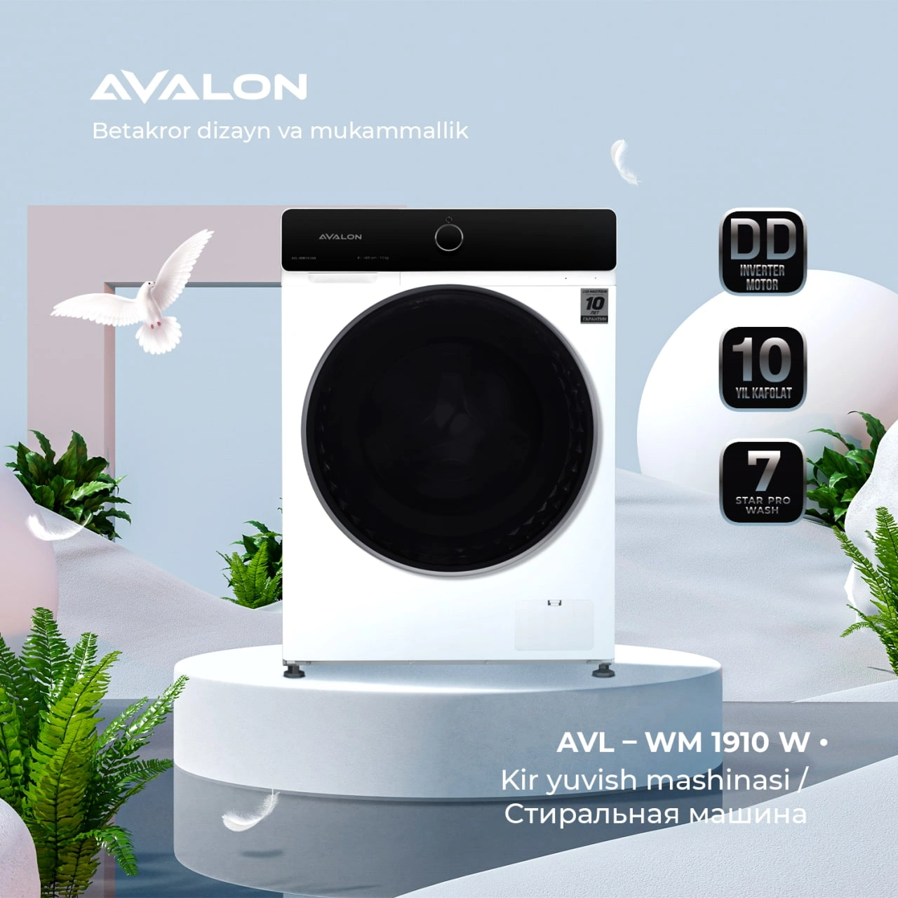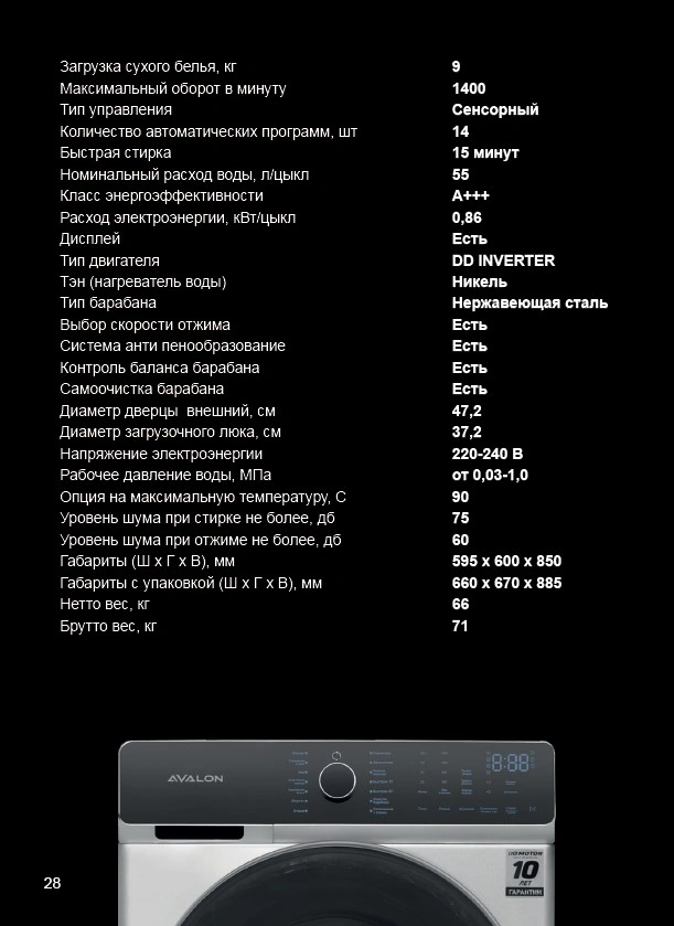 AVALON kir yuvish mashinalari nafis dizayn va ilg'or texnologiyalarni o'zida mujassam etgan. Ushbu kir yuvish mashinasi A+++ energiya samaradorligi darajasiga ega. Kirlarni samarali tozalash va yuvish uchun mo'ljallangan. Ushbu model to'g'ridan-to'g'ri ulangan inverter motoriga ega. U uzoq muddat ishlash, elektr energiyasini tejash hamda shovqinsiz ishlash uchun mo'ljallangan.