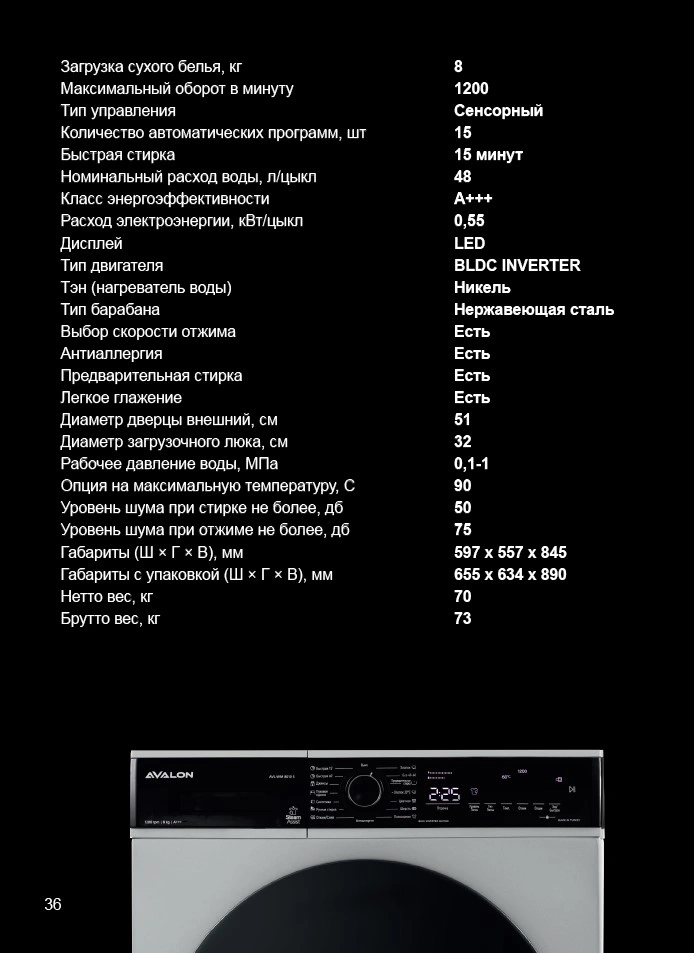 AVALON kir yuvish mashinalari nafis dizayn va ilg'or texnologiyalarni o'zida mujassam etgan. Ushbu kir yuvish mashinasi A+++ energiya samaradorligi darajasiga ega. Kirlarni samarali tozalash va yuvish uchun mo'ljallangan. Ushbu model innovatsion BLDC inverter motoriga ega. U uzoq muddat ishlash, elektr energiyasini tejash hamda shovqinsiz ishlash uchun mo'ljallangan.